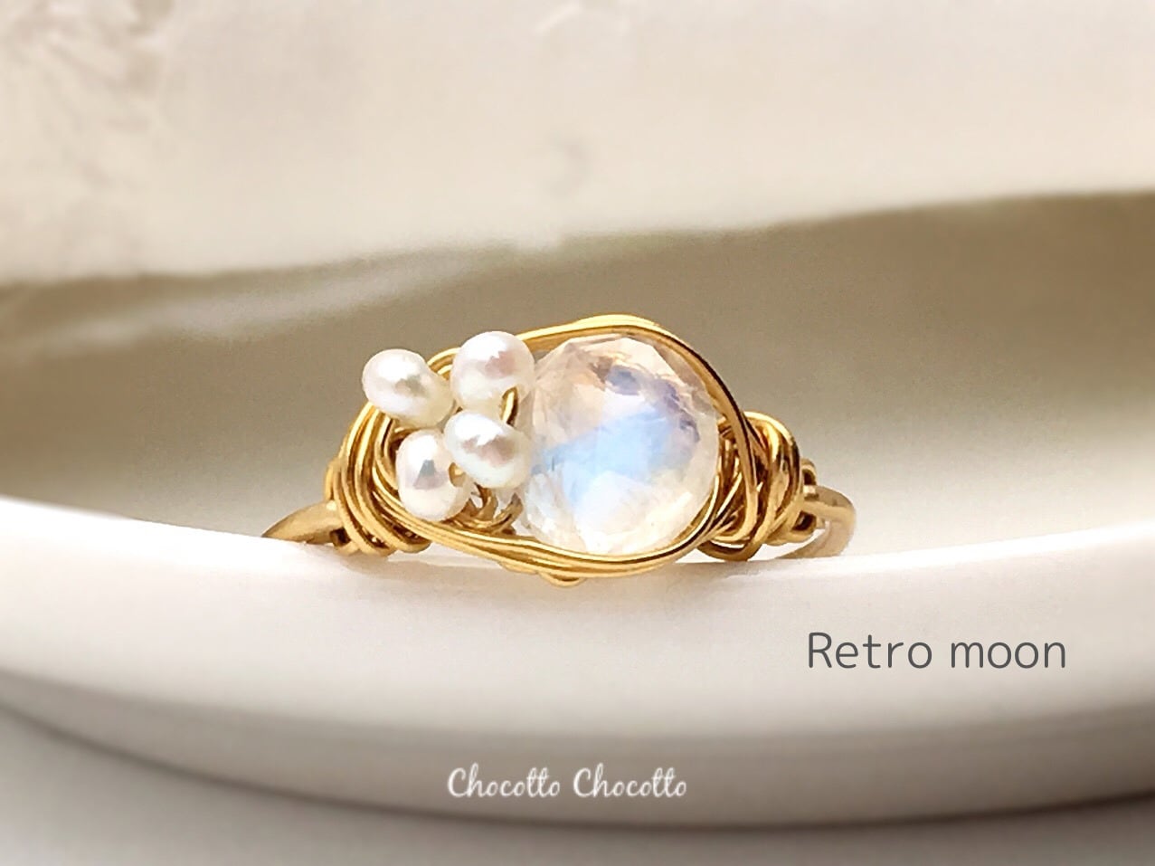 レインボームーンストーンと淡水パールの指輪