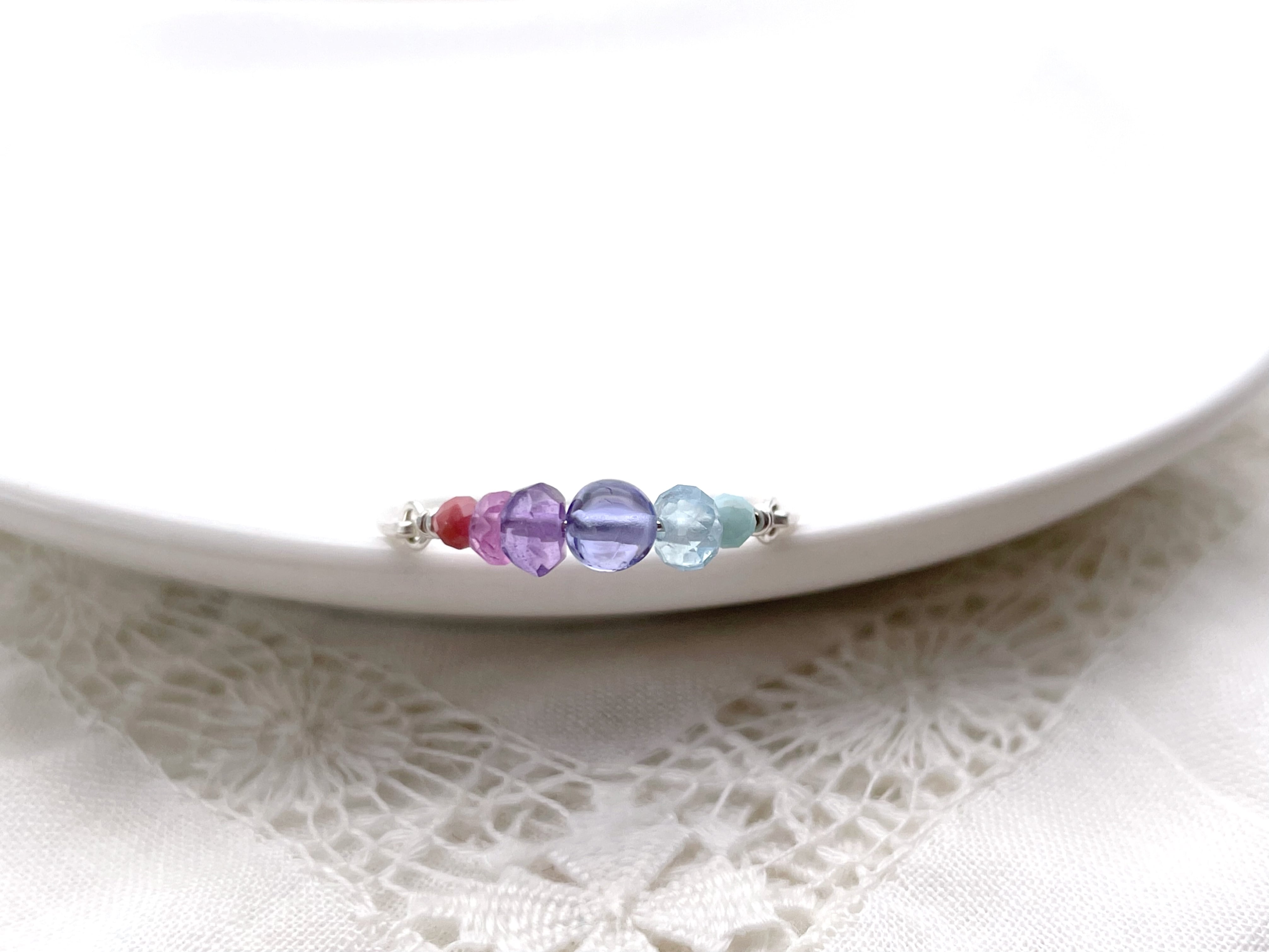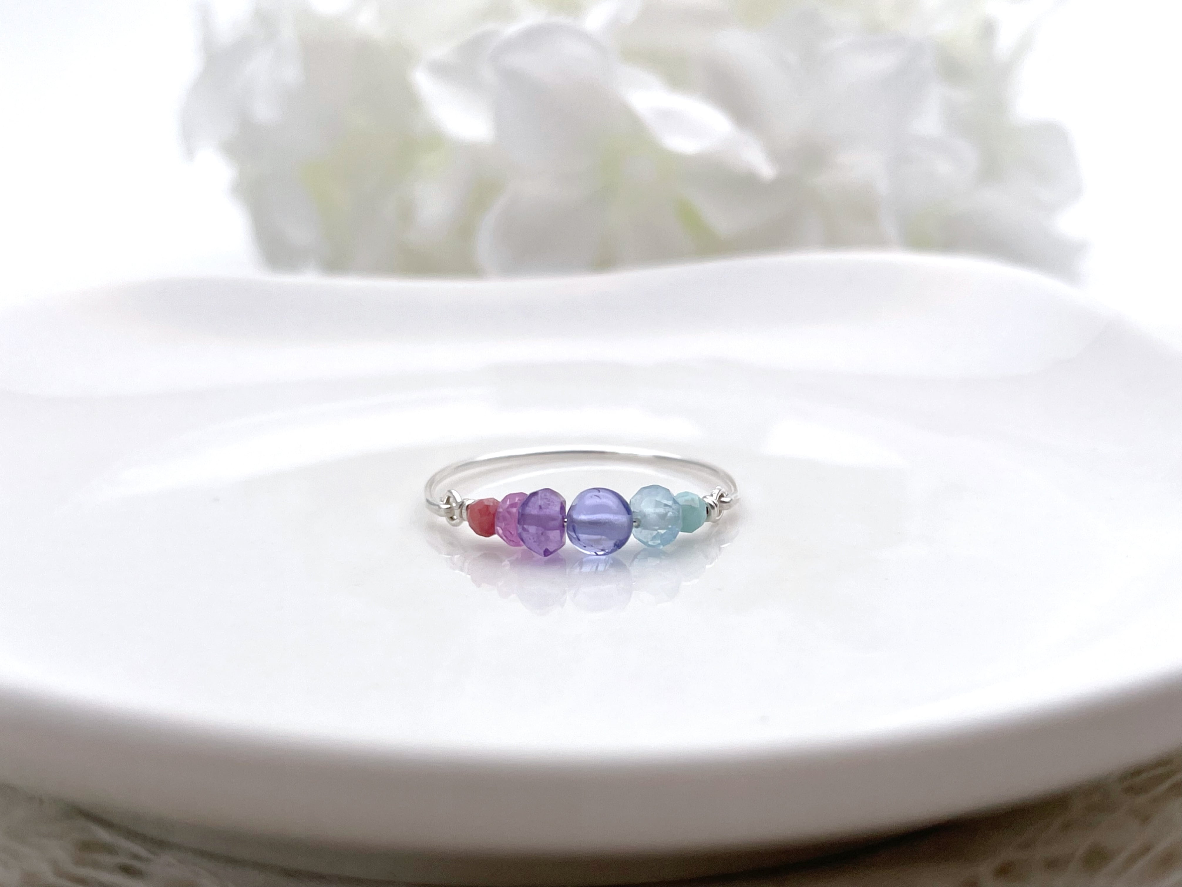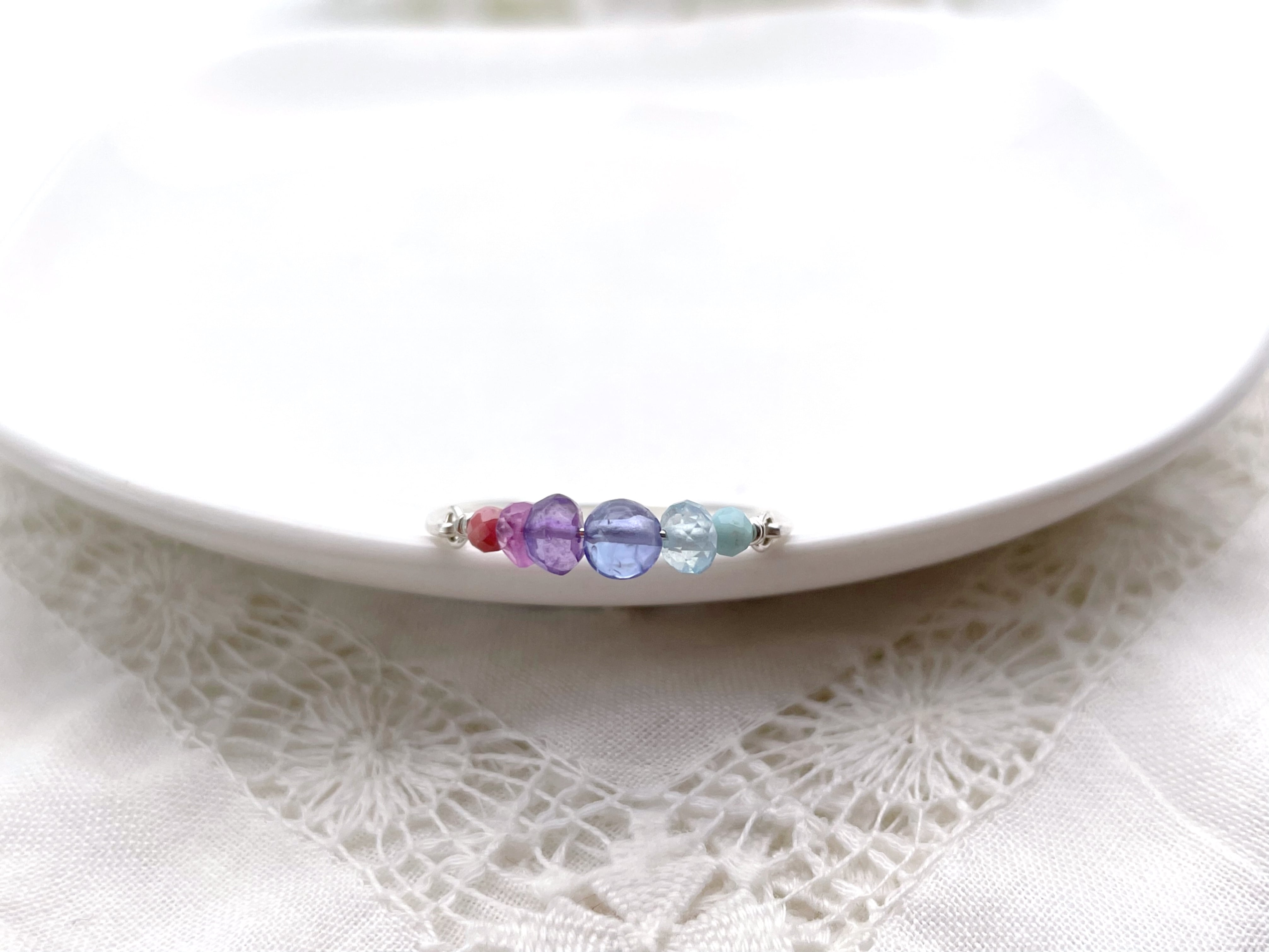 タンザナイトを中心に、ブルー・パープル・ピンク系の天然石をグラデーションで繋いだ、シンプルで優しい色使いのワイヤーリングです。