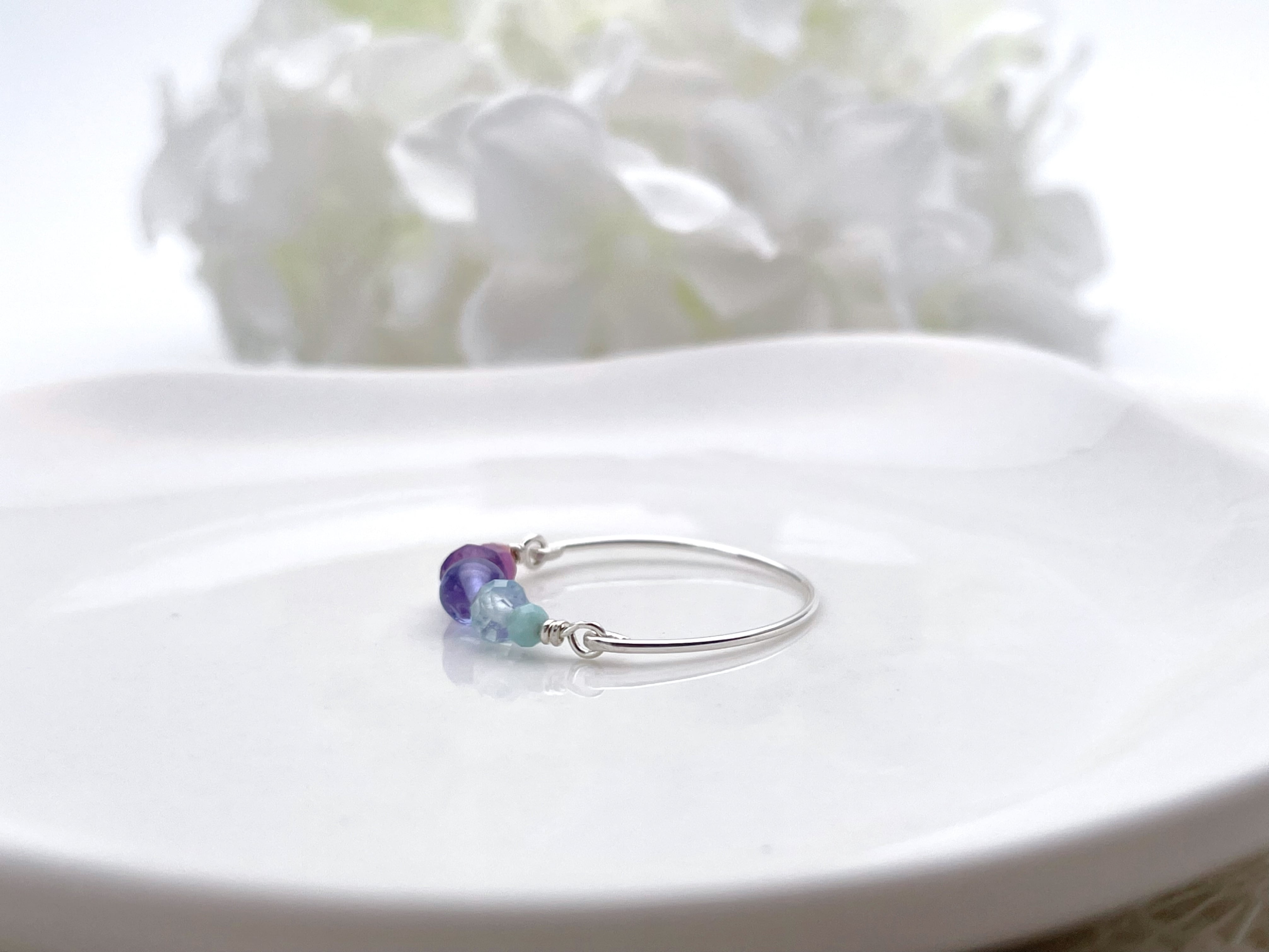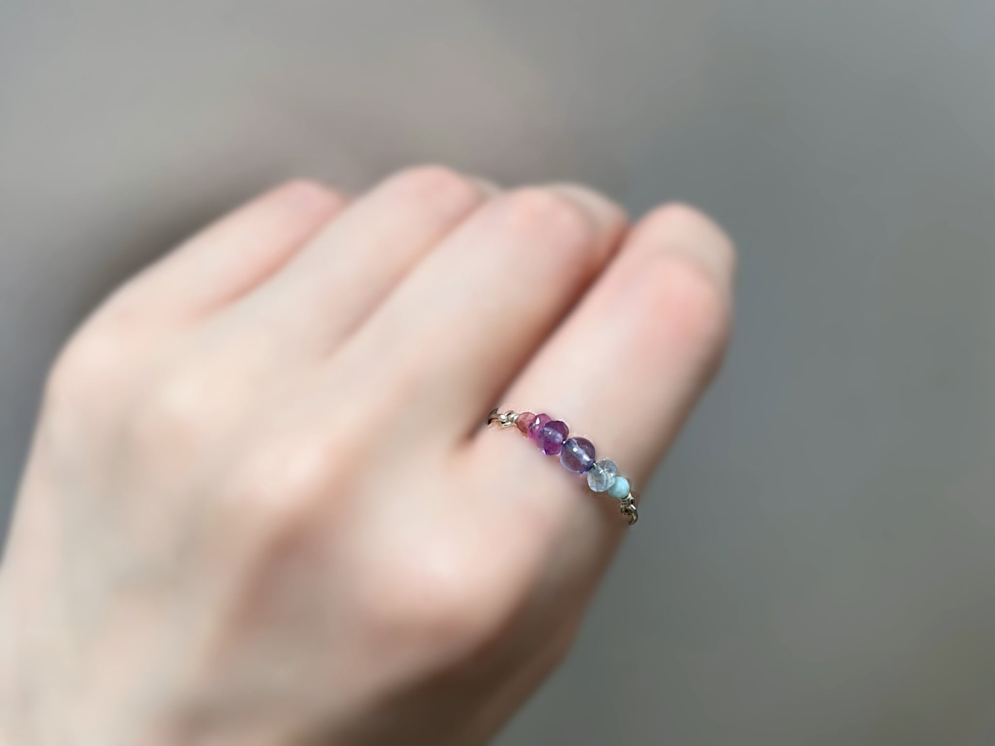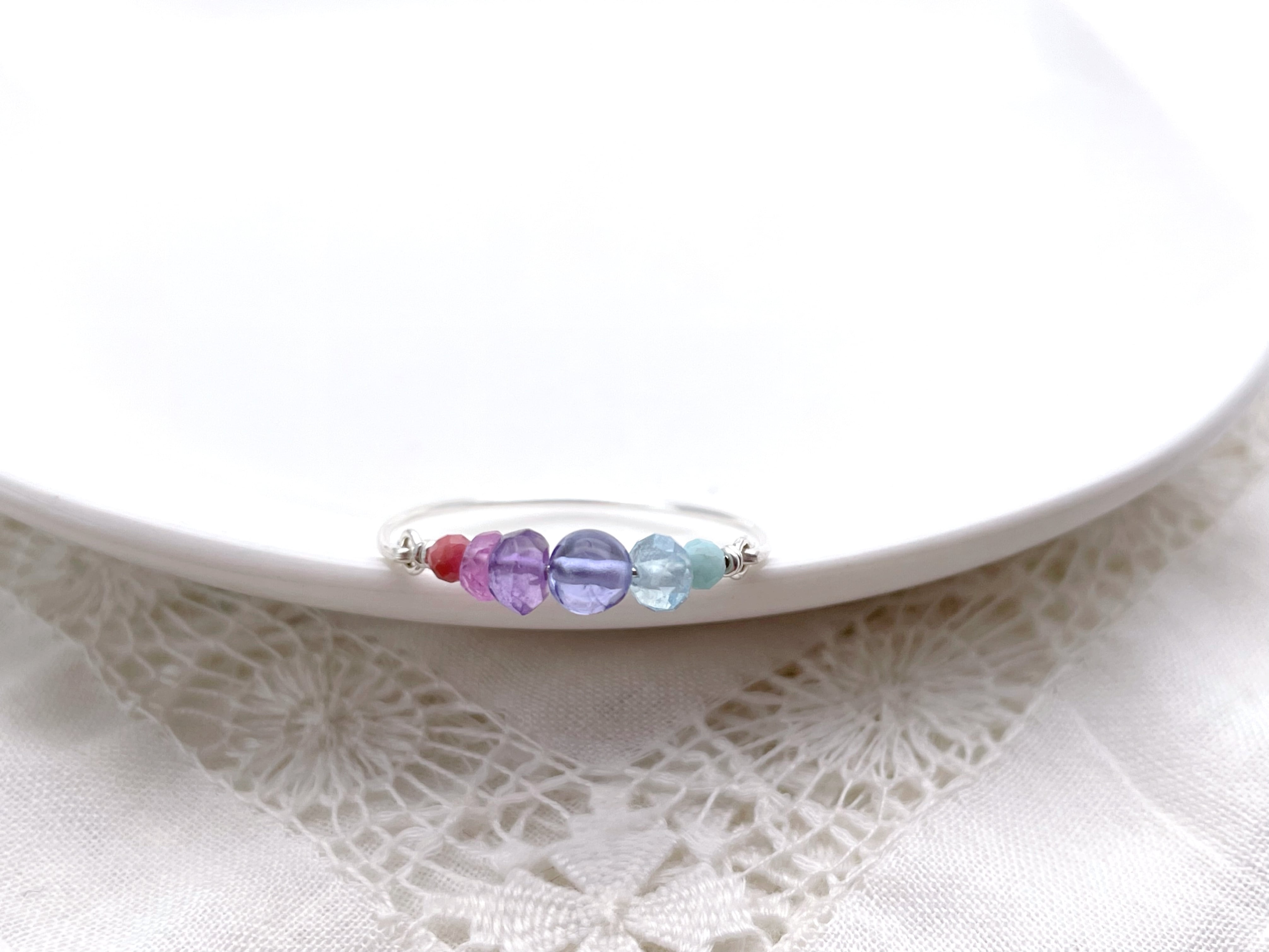 タンザナイトを中心に、ブルー・パープル・ピンク系の天然石をグラデーションで繋いだ、シンプルで優しい色使いのワイヤーリングです。