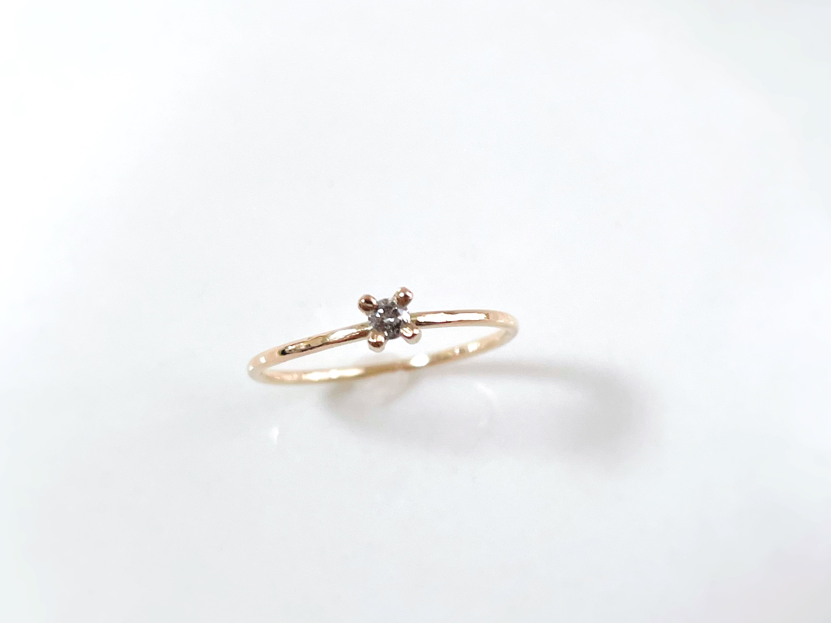 ダイヤモンドには内包物が含まれており、グレーを帯びたような色合いです。華奢ですが強い輝きを放ち、しっかりとしたアクセントになります。