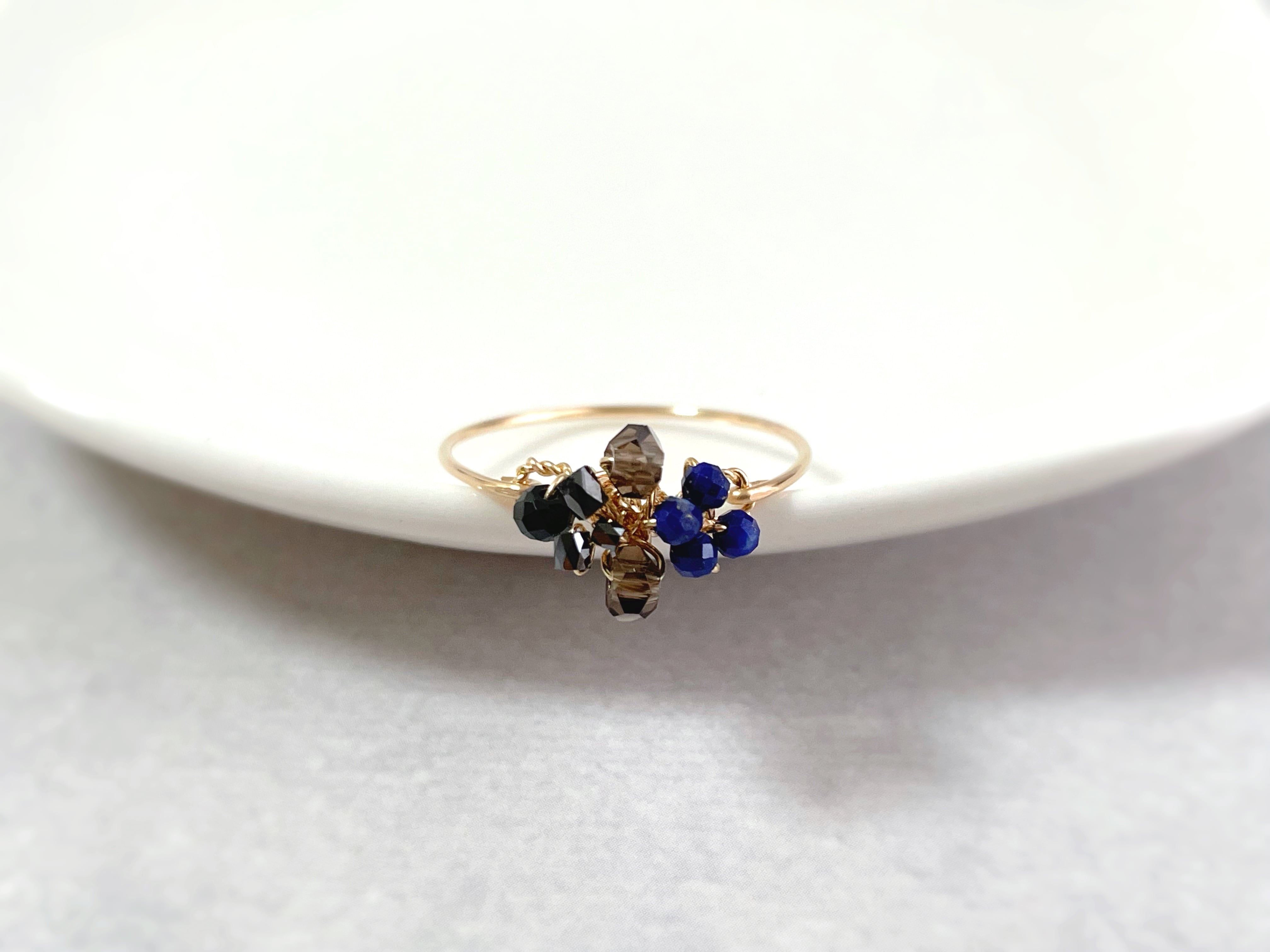 ブラックダイヤモンド、ブラックスピネル、ラピスラズリ、スモーキークォーツを組み合わせたワイヤーリングです。小さな天然石たちが集まってきらめくデザインにしました。