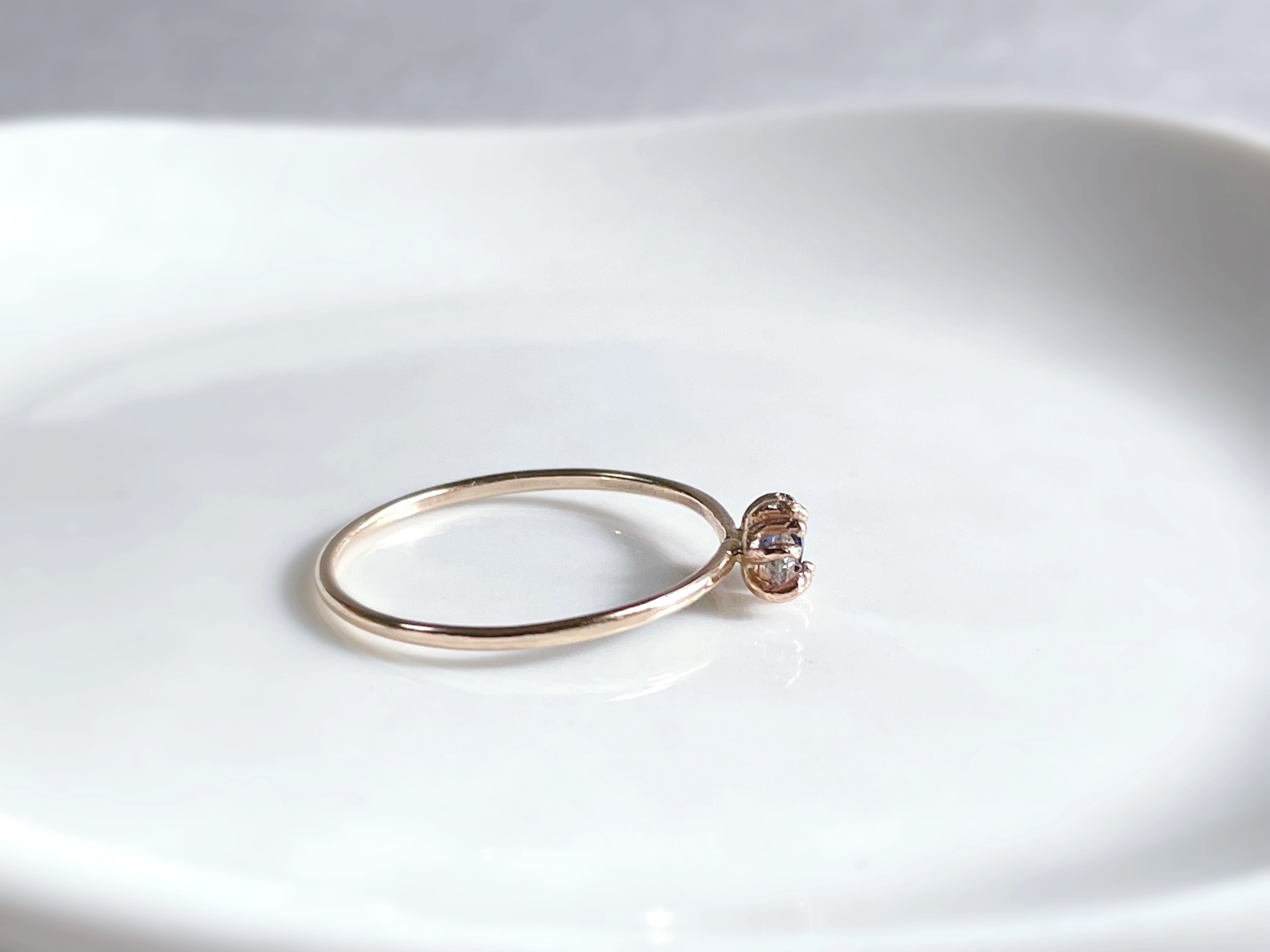ダイヤモンドには内包物が含まれており、グレーを帯びたような色合いです。華奢ですが強い輝きを放ち、しっかりとしたアクセントになります。