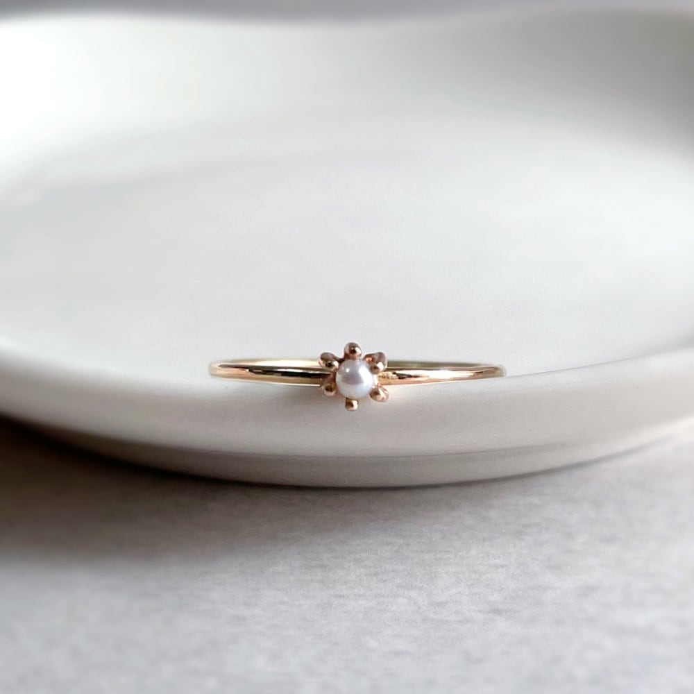 とても小さな淡水パールを包み込むように留めたリングです。