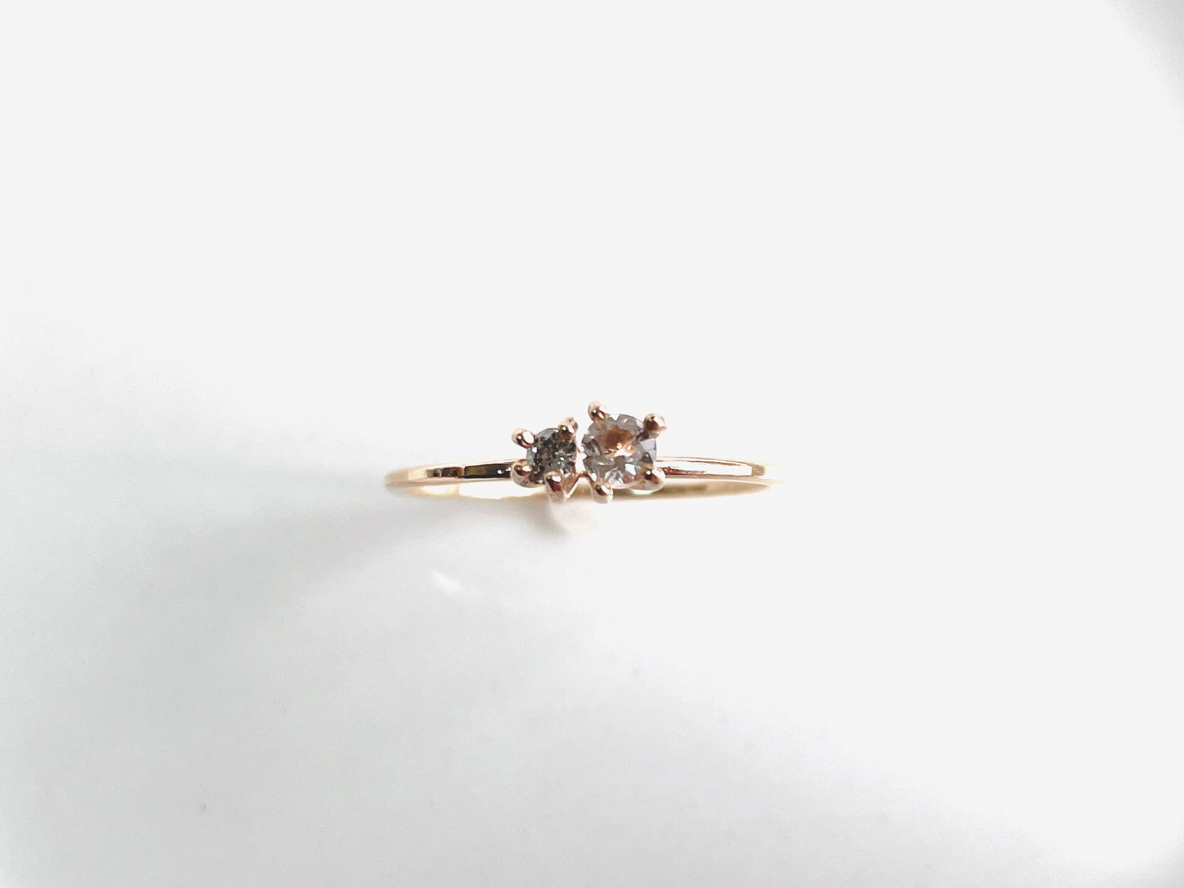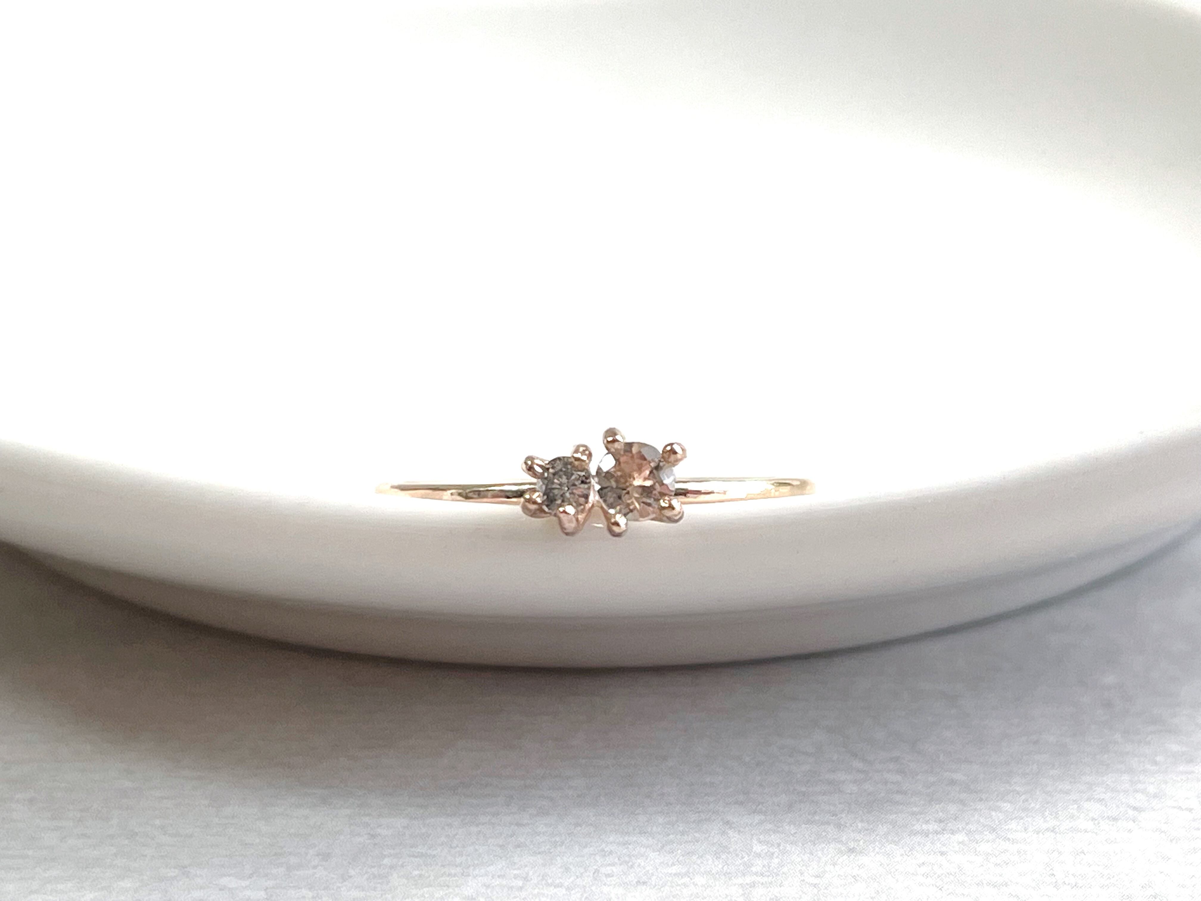 ダイヤモンドには内包物が含まれており、グレーを帯びたような色合いです。華奢ですが強い輝きを放ち、しっかりとしたアクセントになります。
