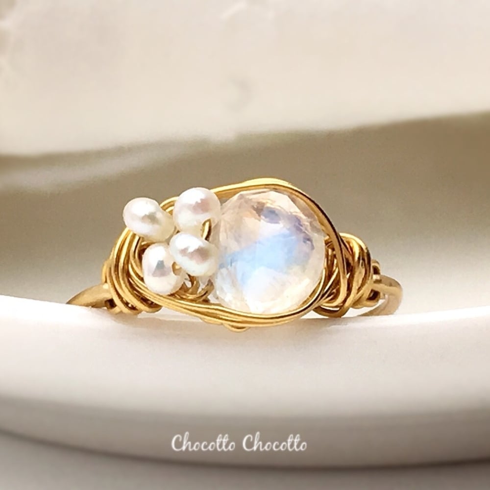 「Retro moon - レインボームーンストーンと淡水パールのワイヤーリング」