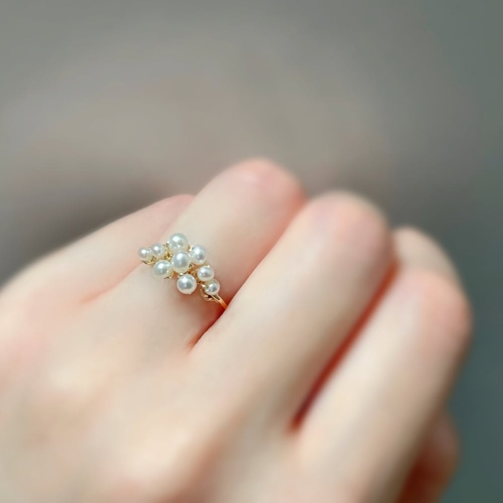淡水パールをランダムに散りばめたワイヤーリングです。名前のとおり、一つひとつのパールがつぶつぶと美しい光を放ちます。