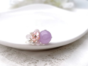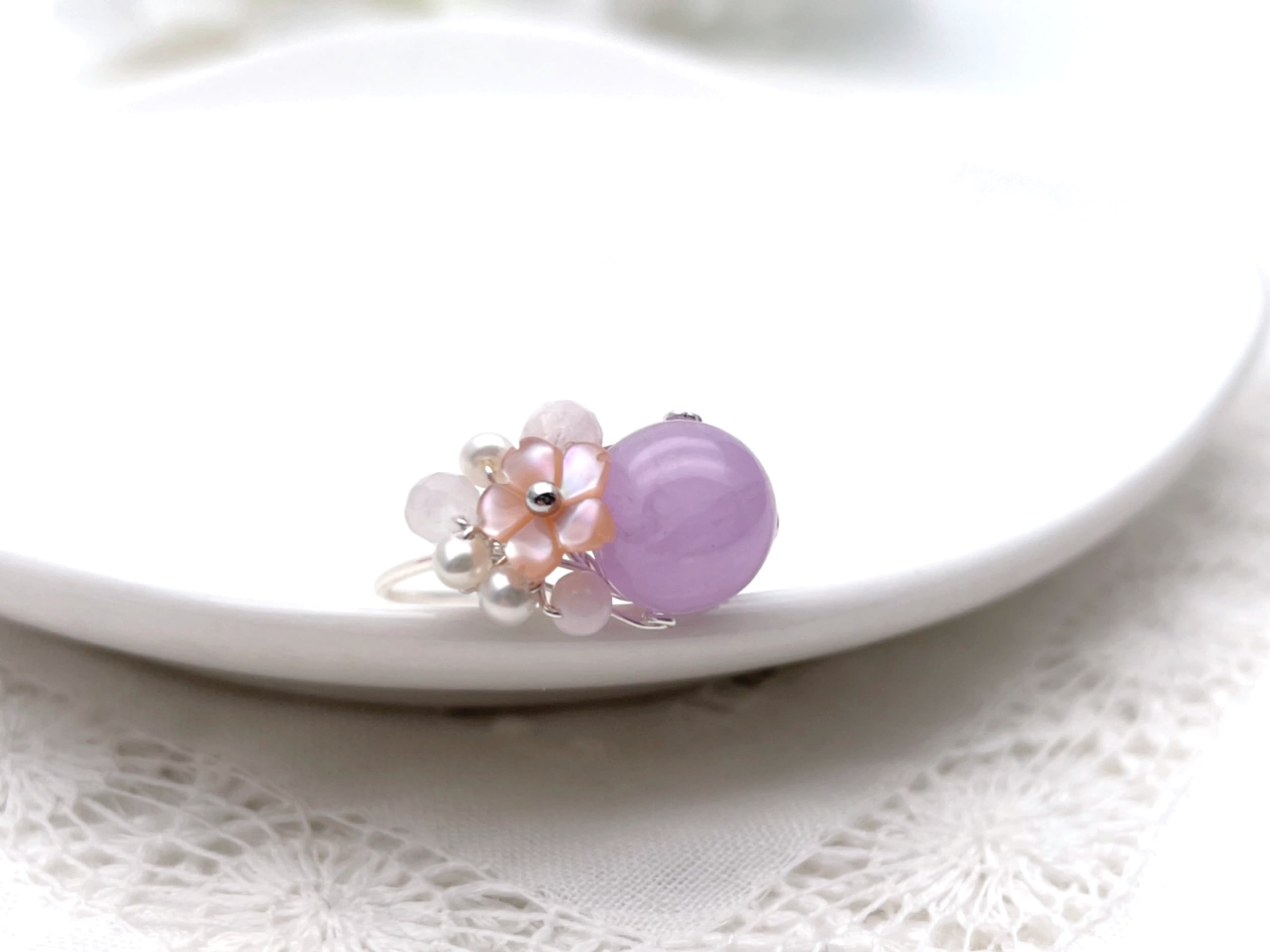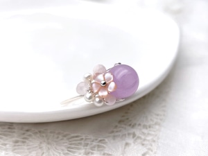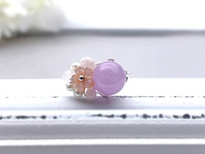 淡いピンクパープルのクンツァイトは表面が滑らかで美しいつやがあります。桜のピンクシェルや小さな天然石とのお色の相性も良くとても上品な雰囲気です。