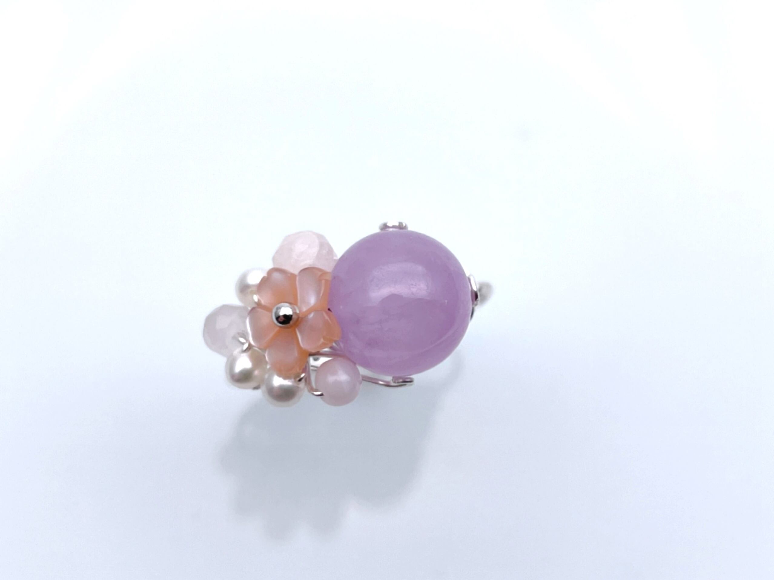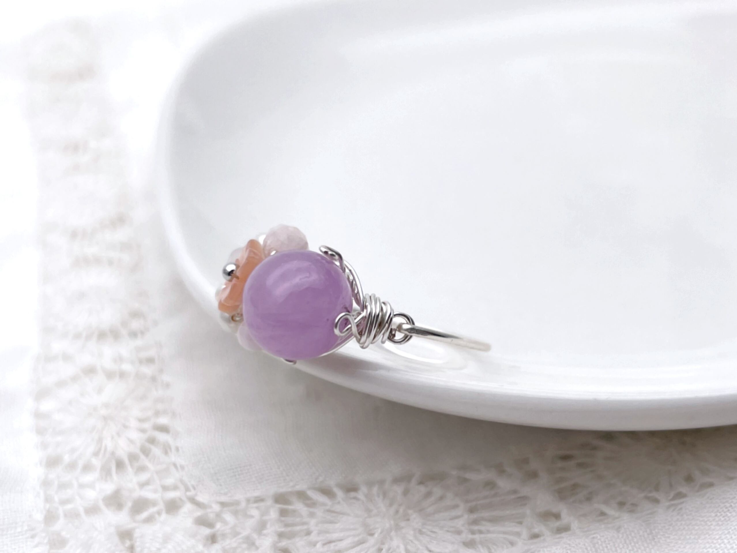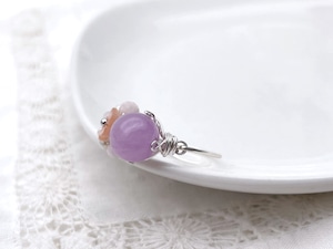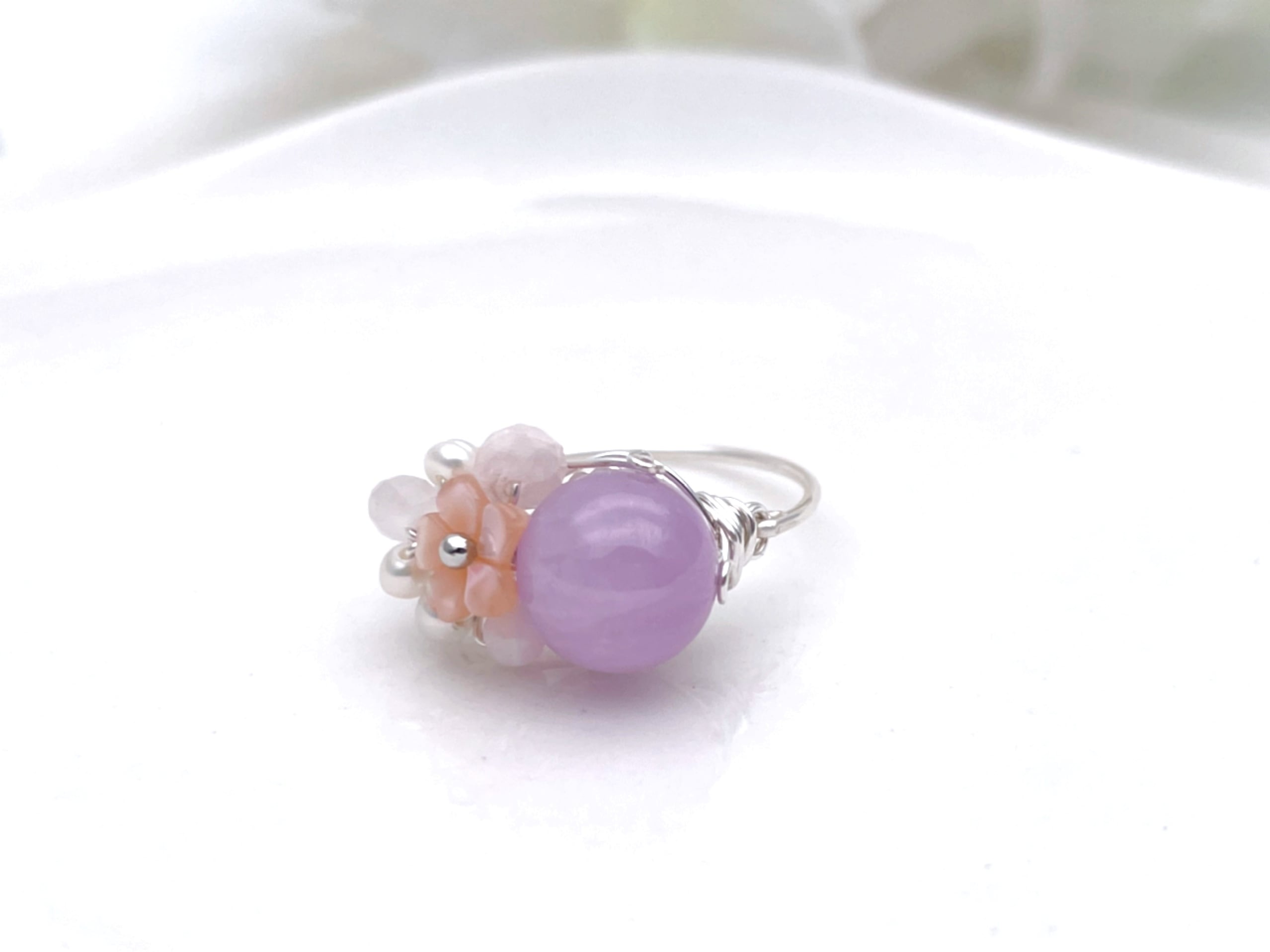 クンツァイトにピンクシェルと4種類の天然石の装飾を施したワイヤーリングです。
