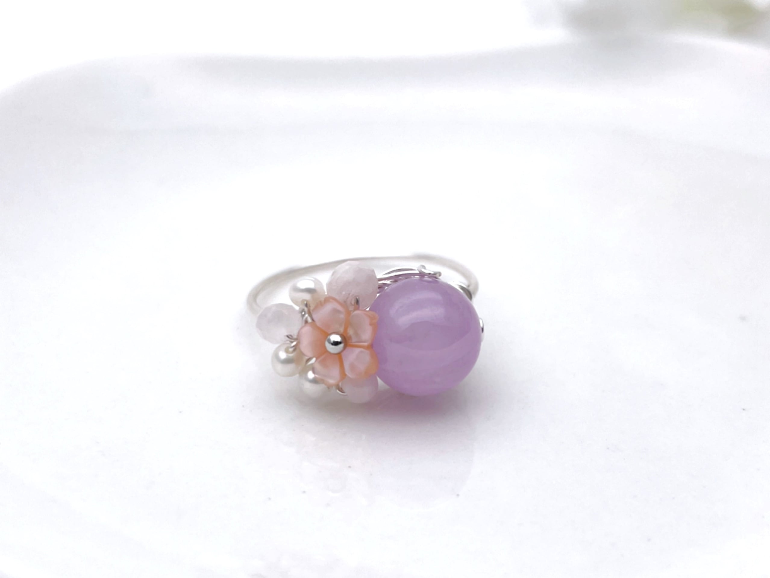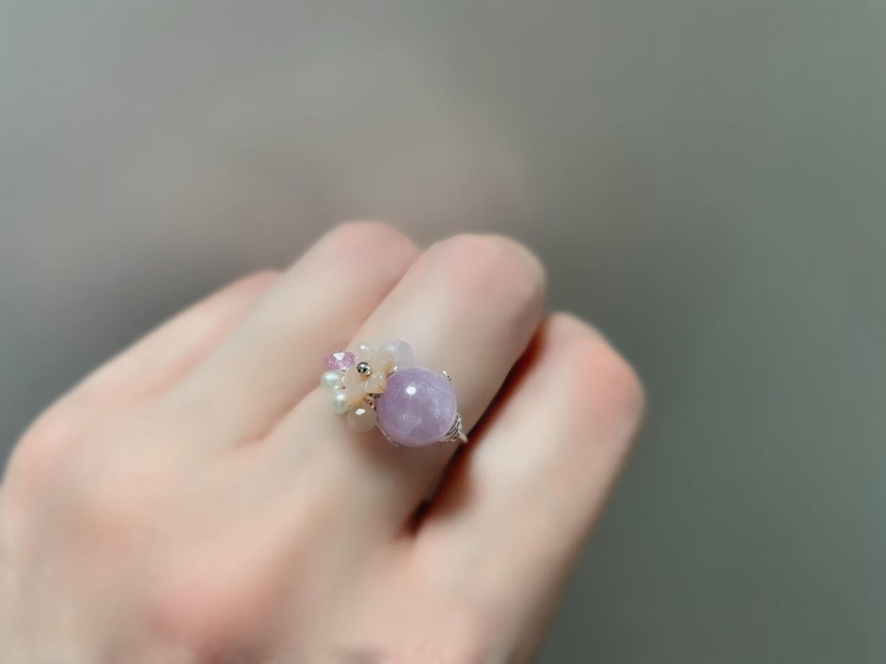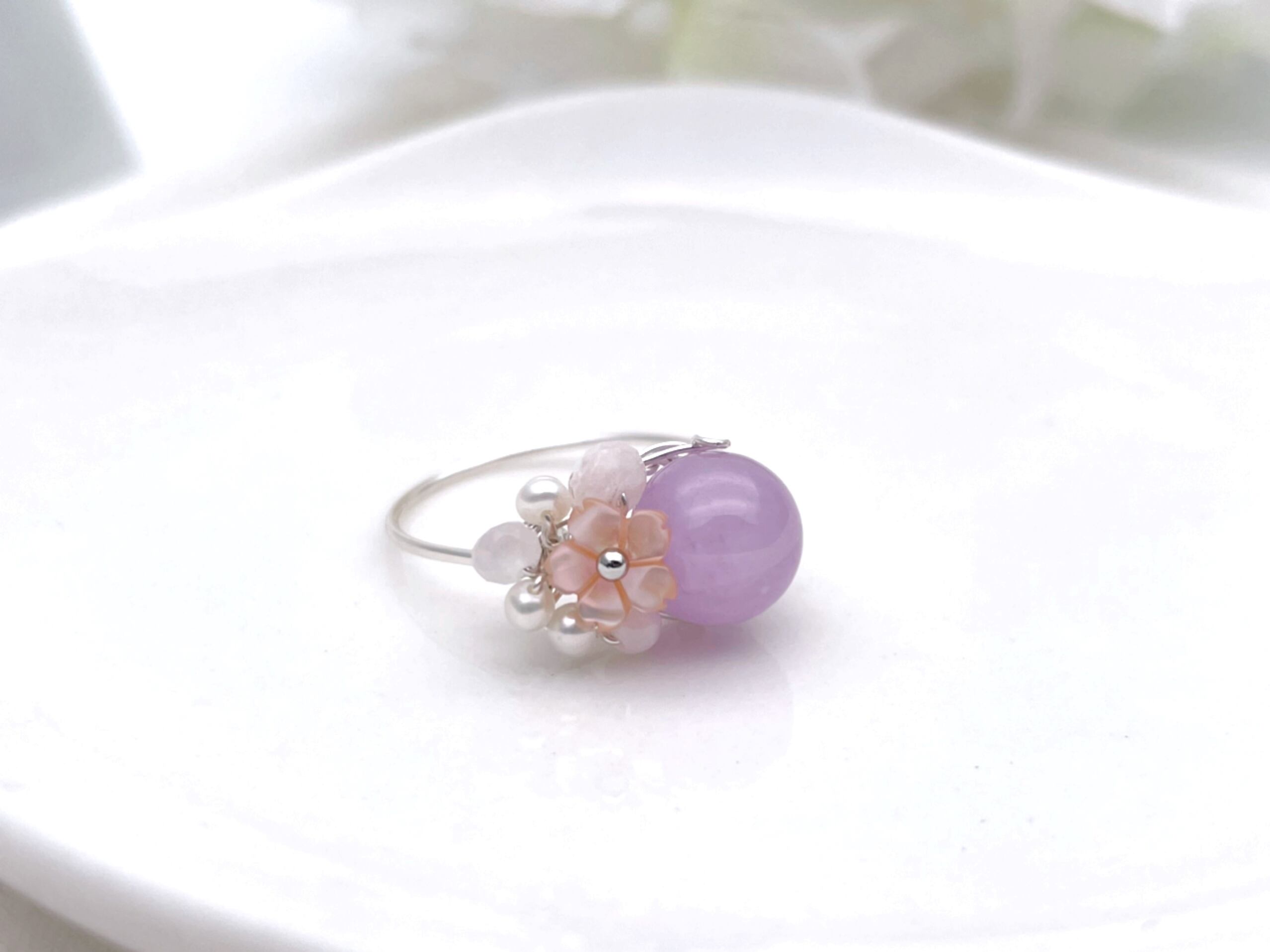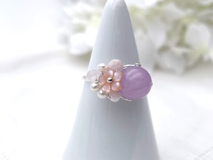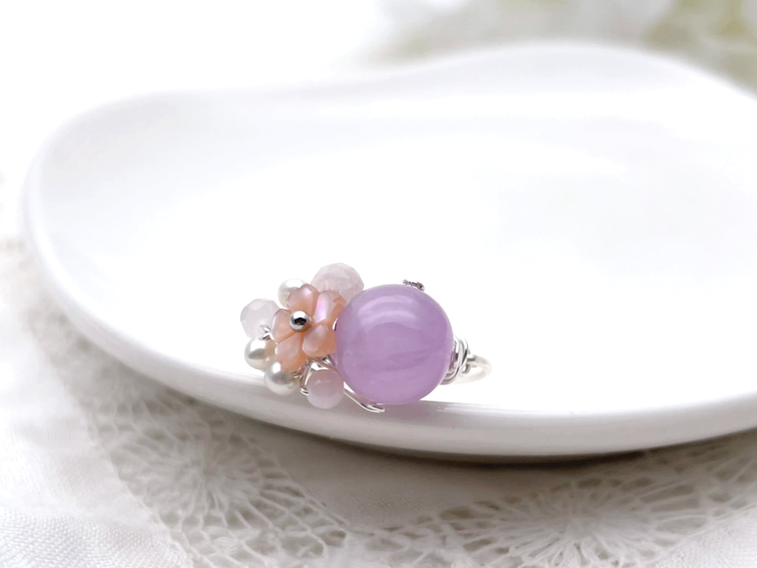 クンツァイトにピンクシェルと4種類の天然石の装飾を施したワイヤーリングです。