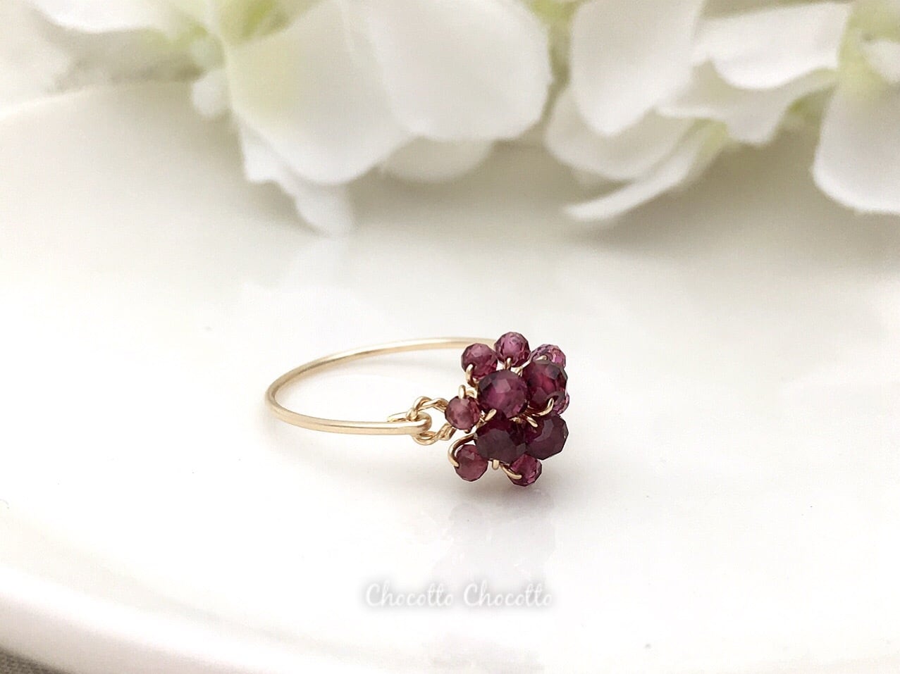 深みのあるワインレッドが美しいロードライトガーネットを、小さなブーケのように束ねたワイヤーリングです。
