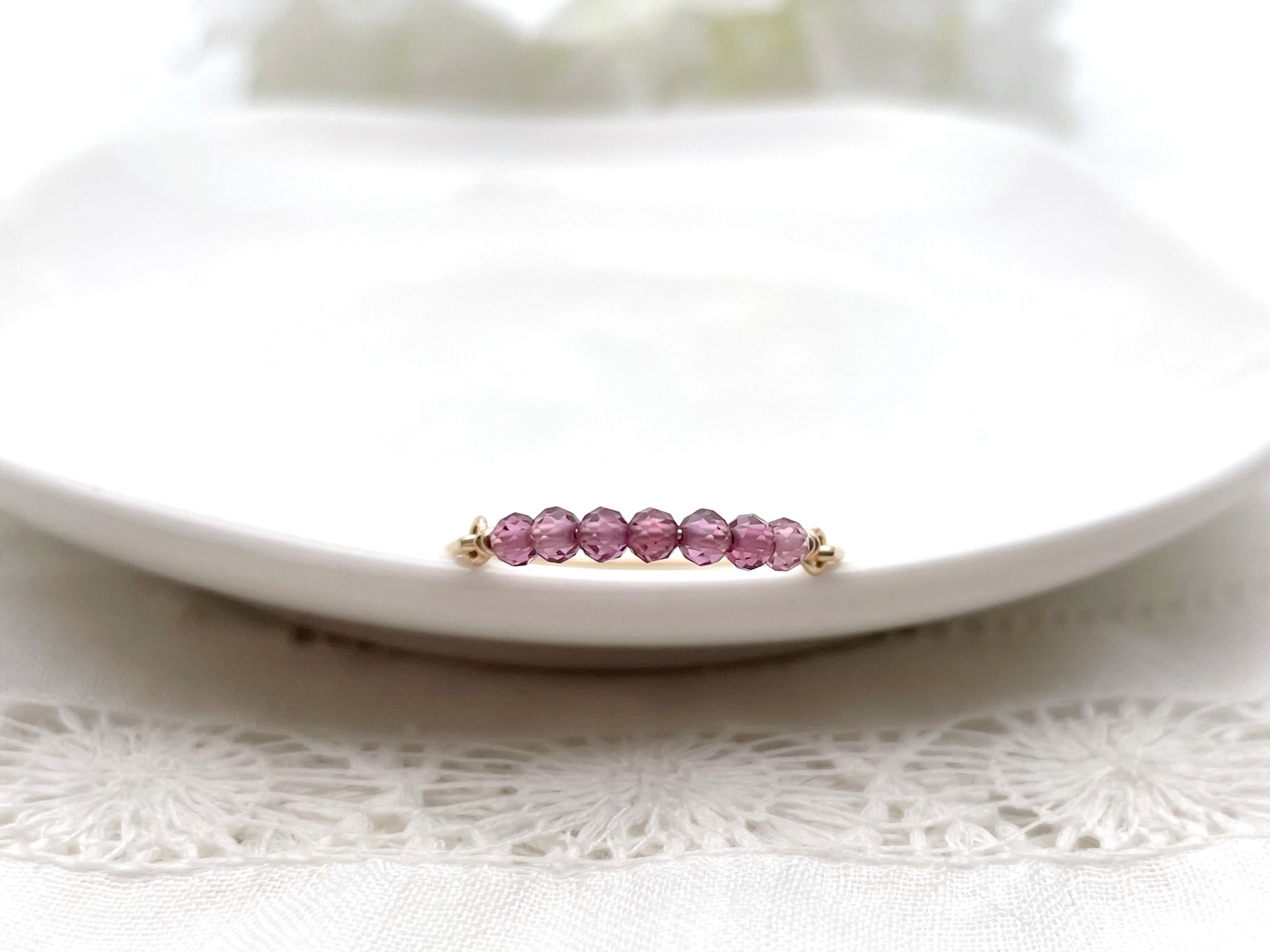淡いパープルのストーンがライン状に並びキラキラと美しい輝きを放ちます。ガーネットはお色の濃さによって黒っぽくなりがちですが、使用しているロードライトガーネットは鮮やかな明るい発色です。