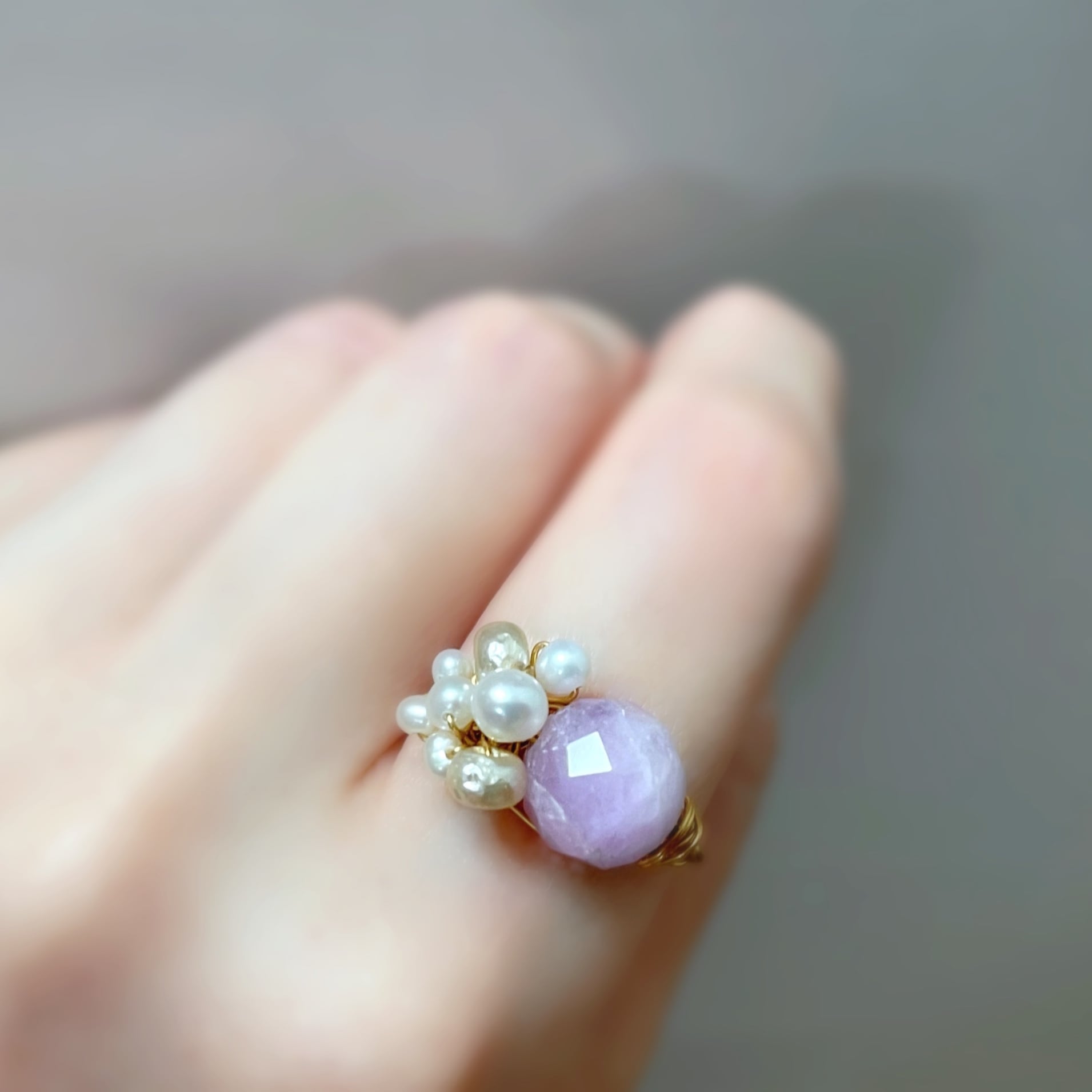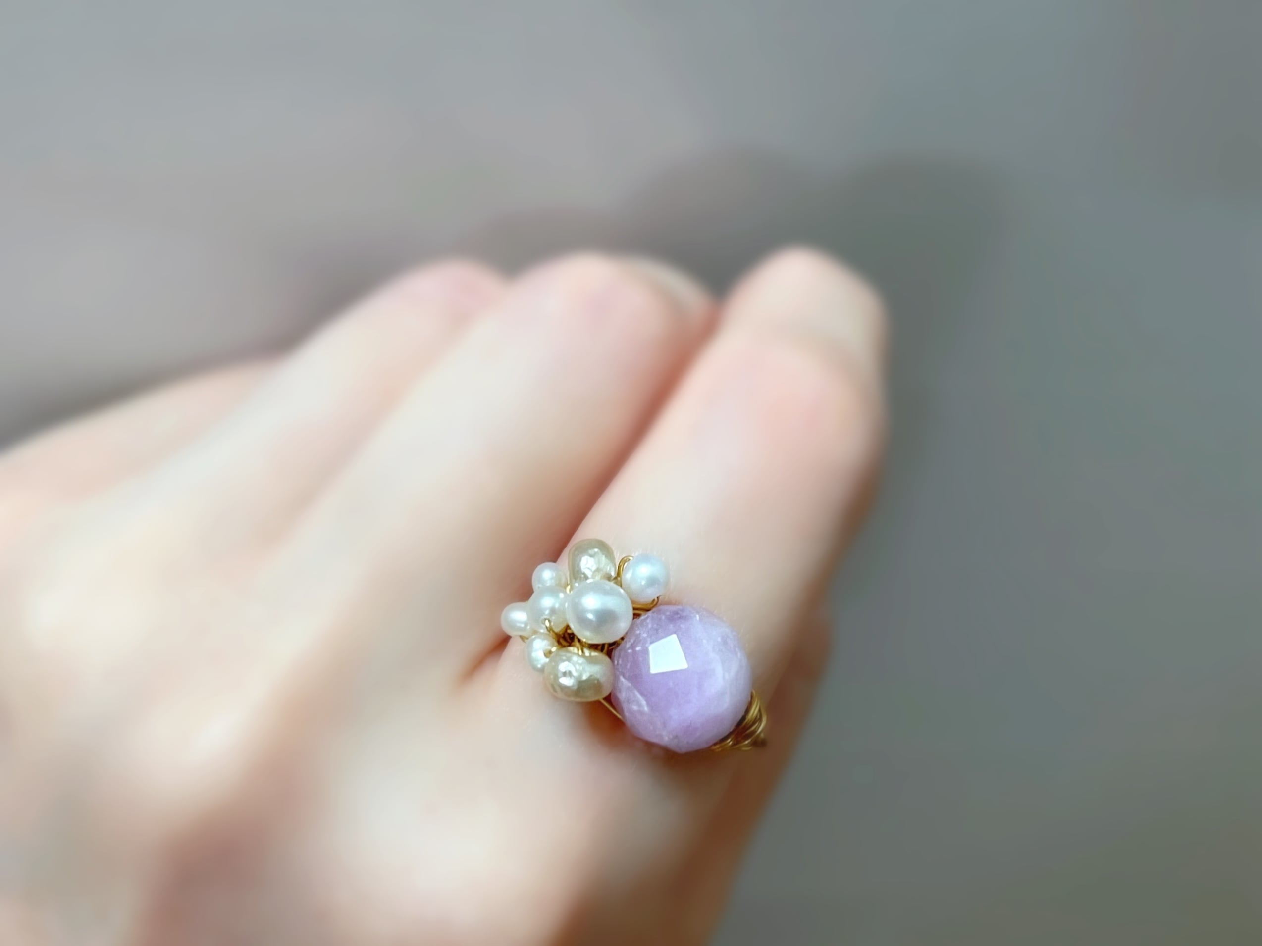 柔らかなライラックピンクのクンツァイトに淡水パールとバロックビーズをあしらったワイヤーリングです。