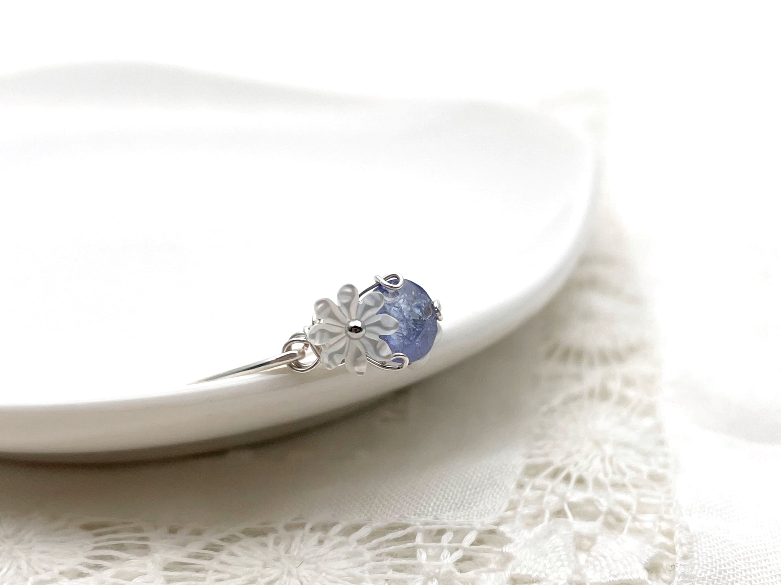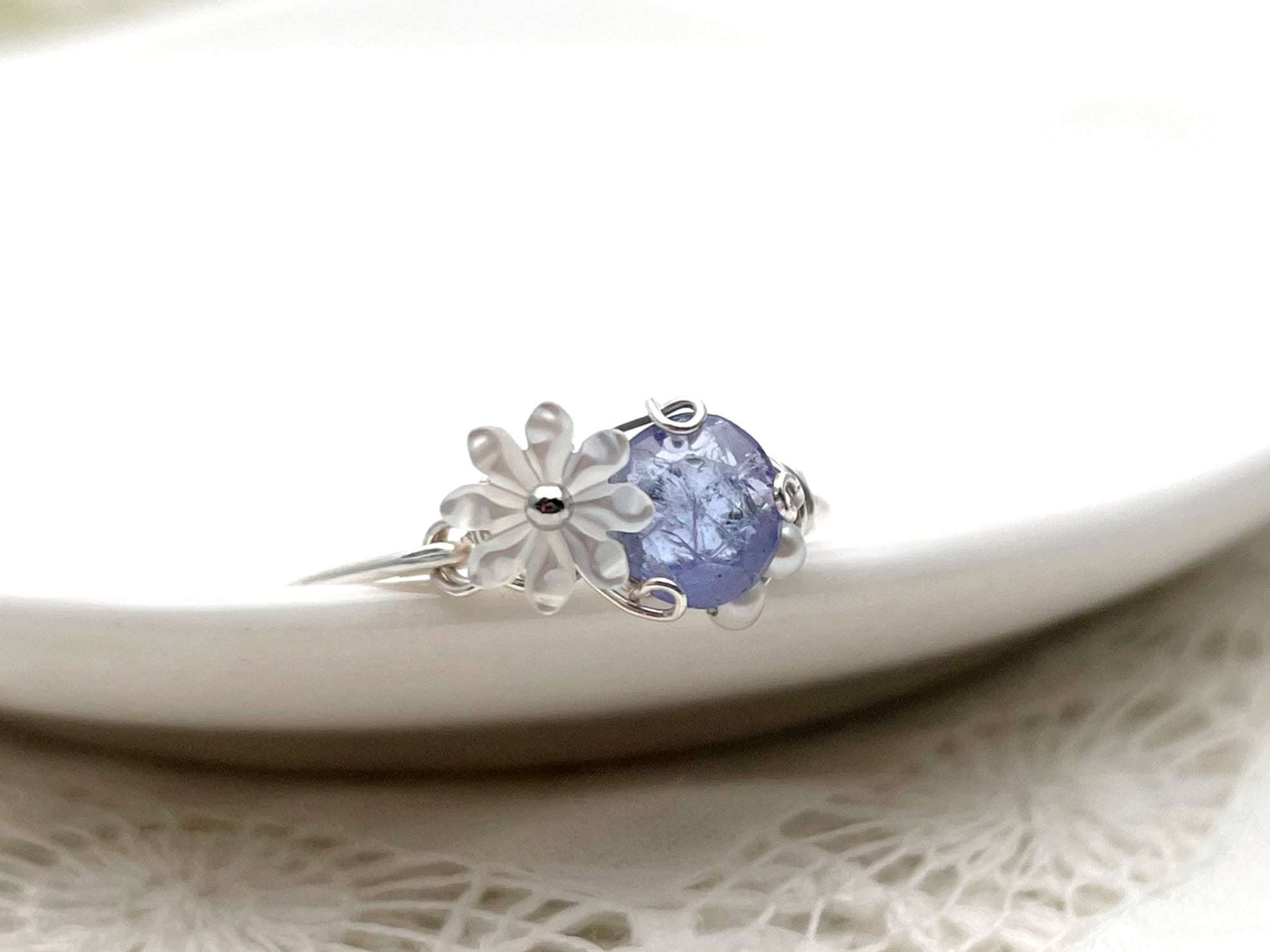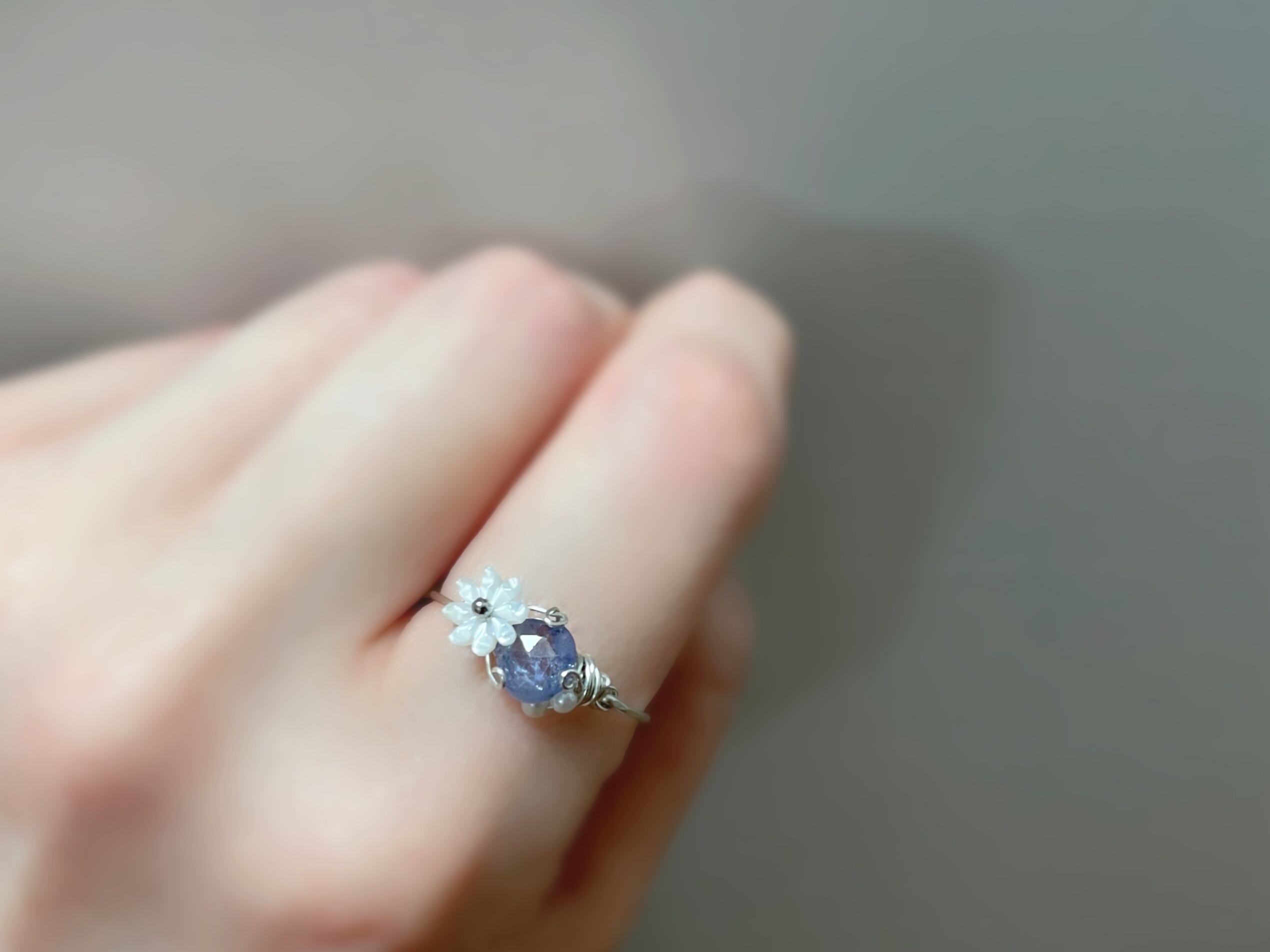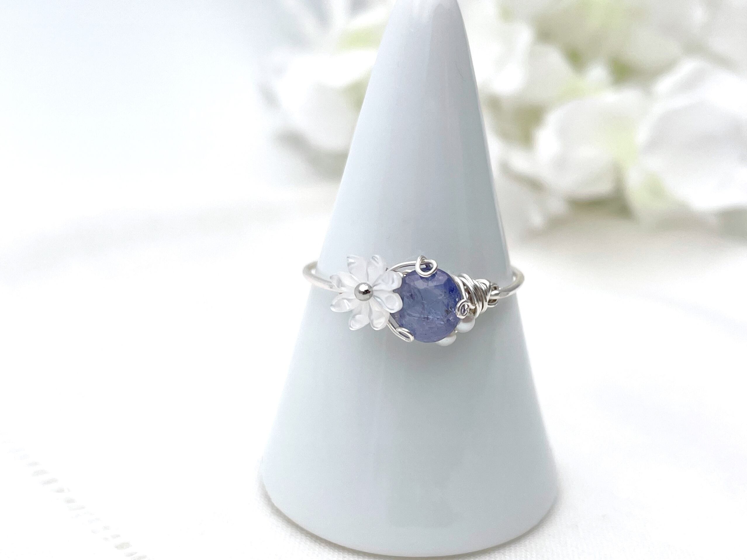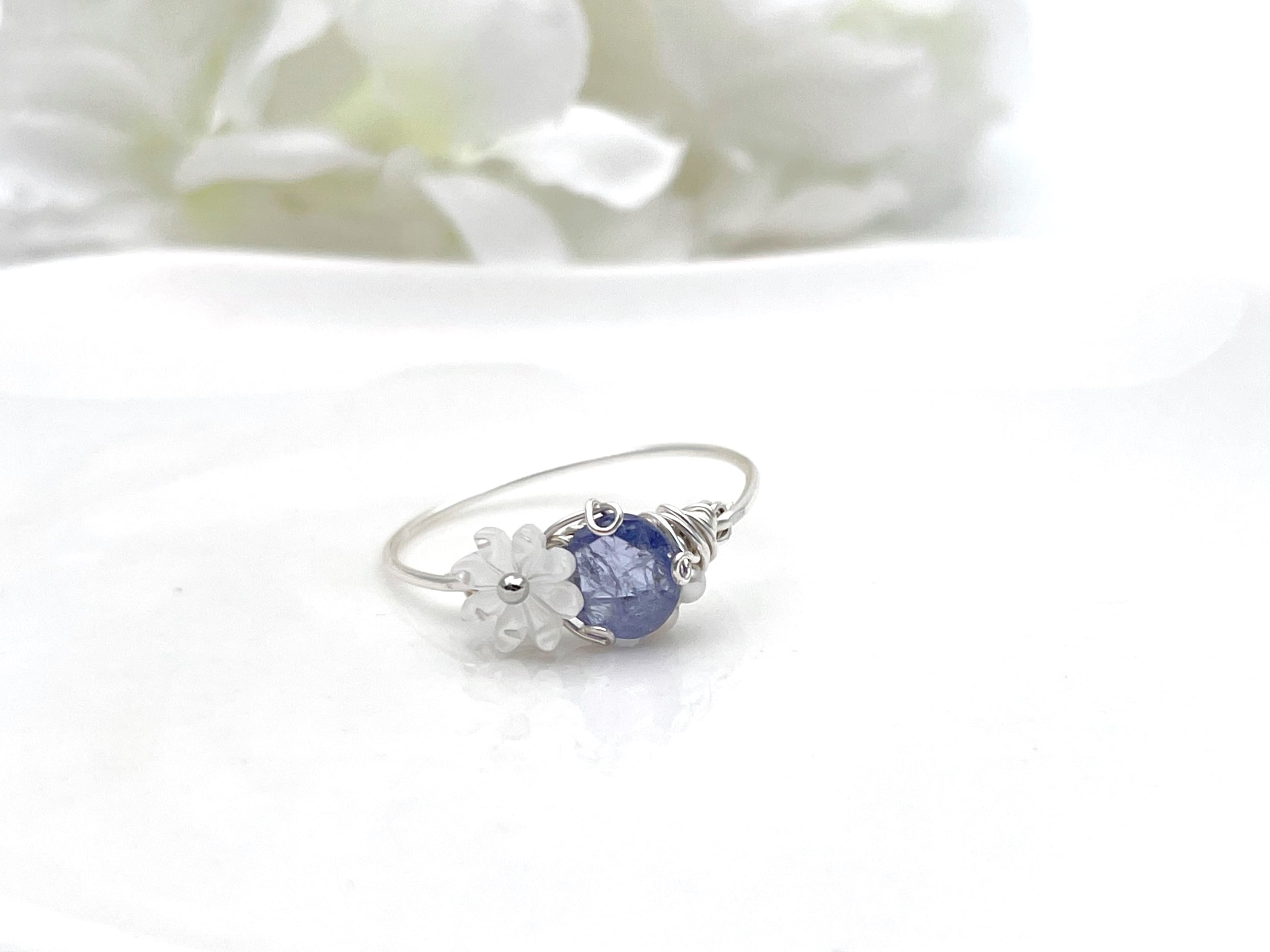 淡いバイオレットブルーのタンザナイトに白蝶貝と淡水パールの装飾を施したワイヤーリングです。