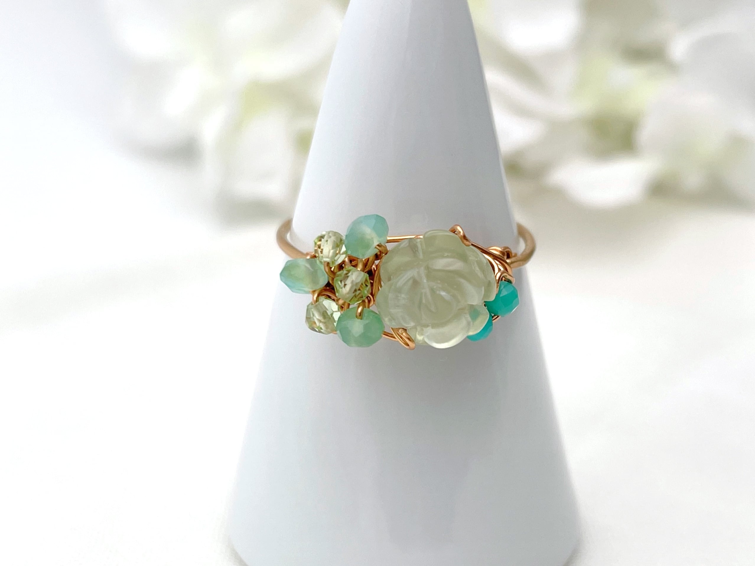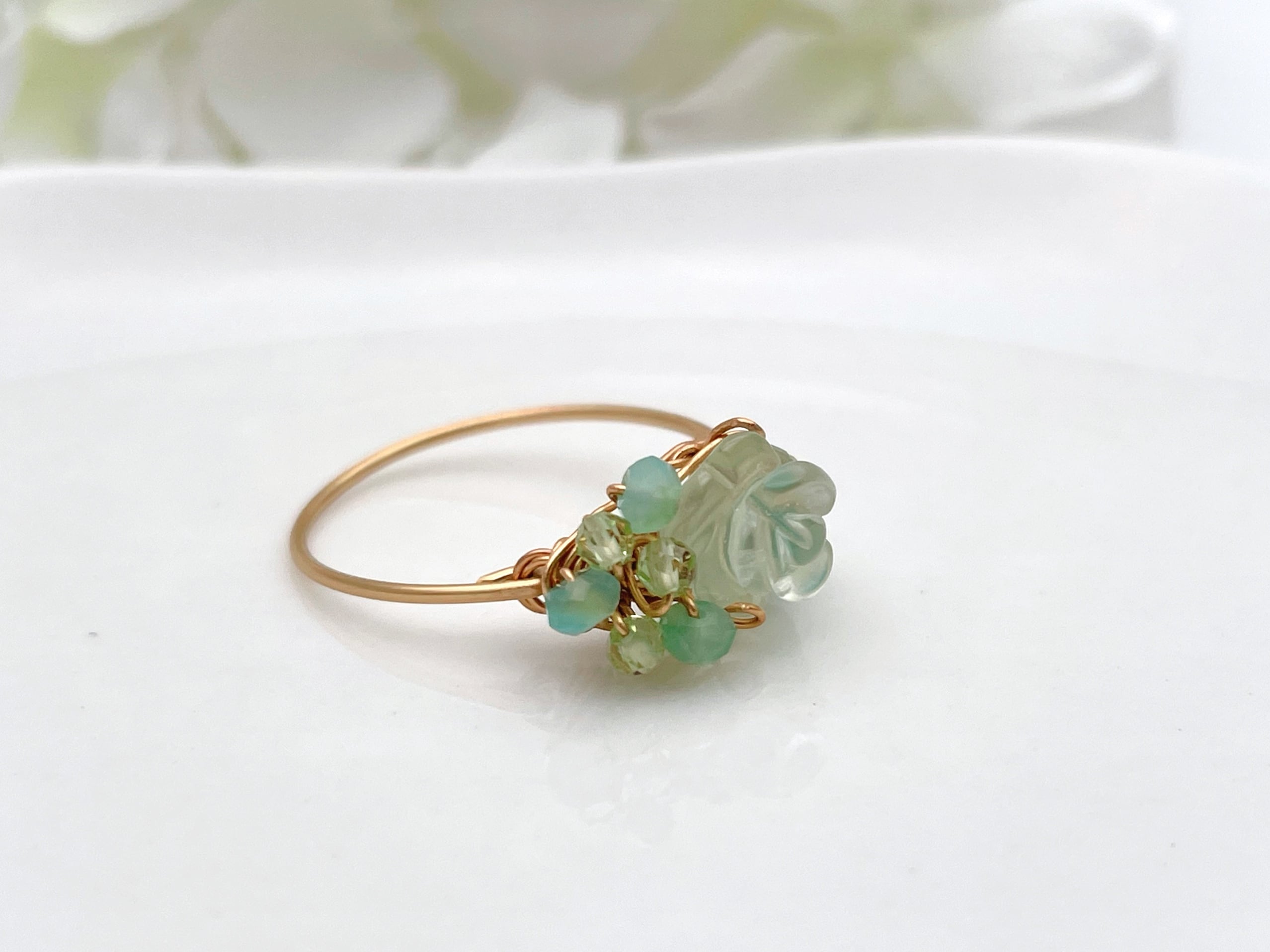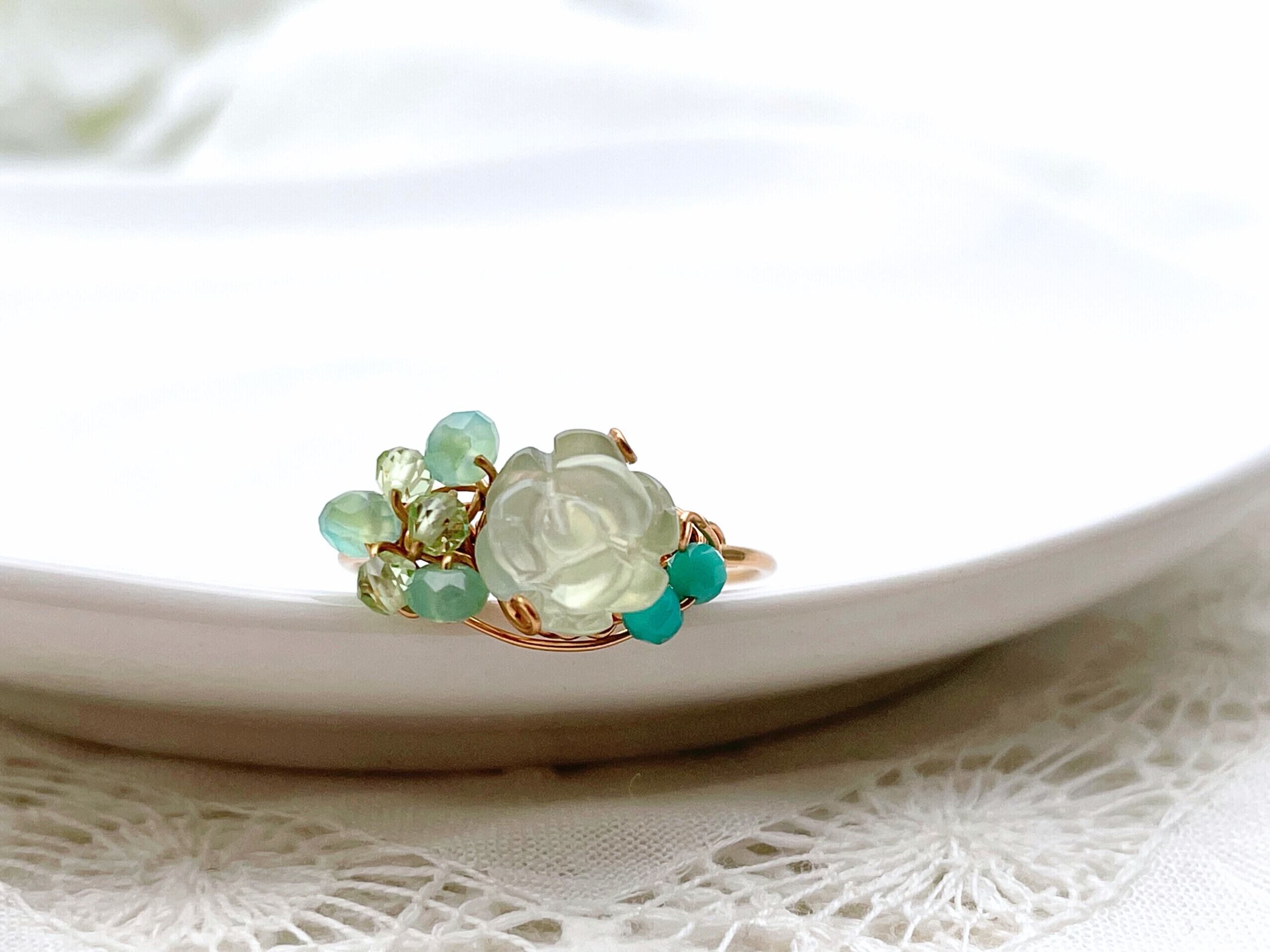 薔薇の彫刻が施されたプレナイトと小さな天然石でお作りしたワイヤーリングです。
