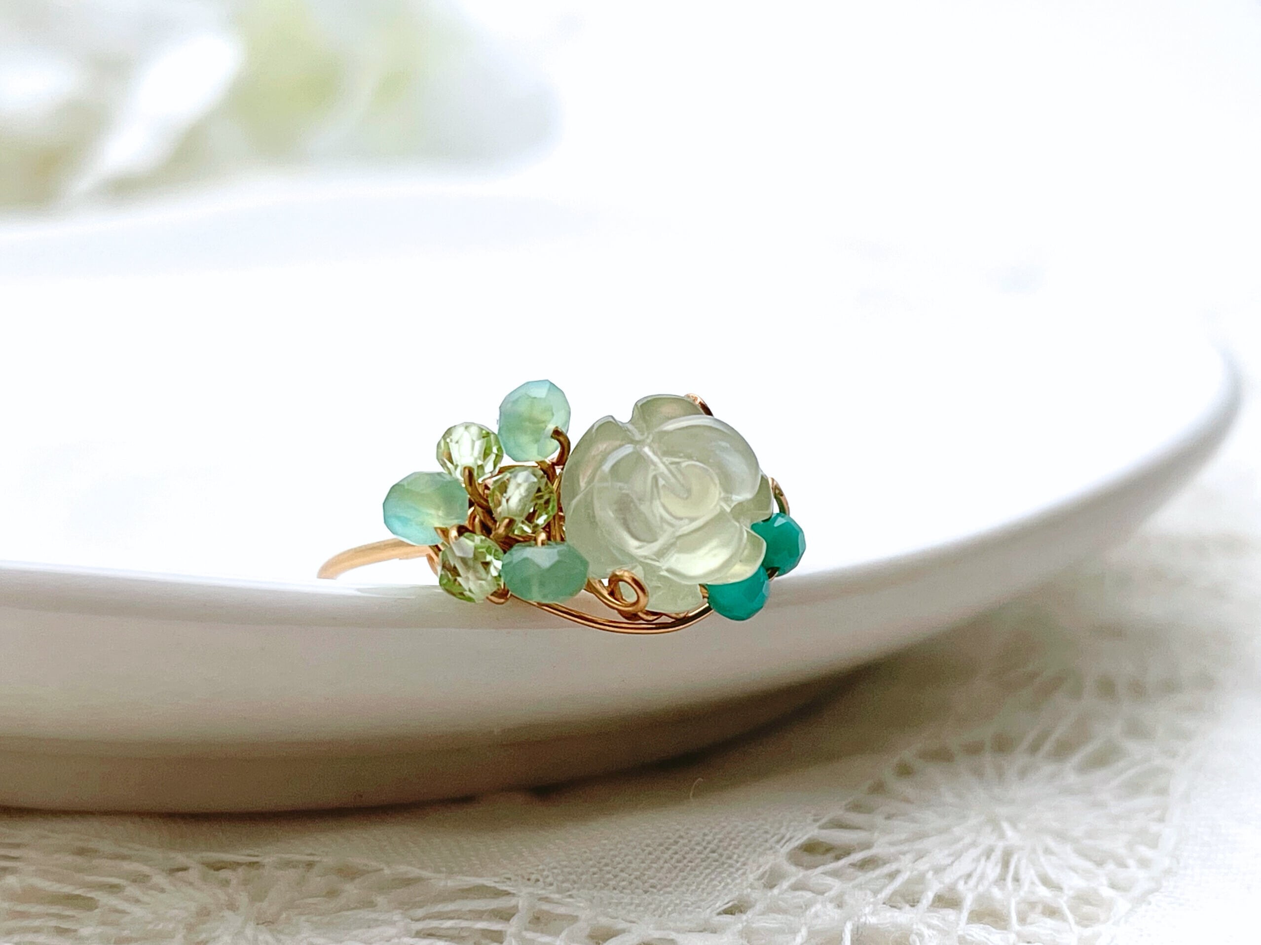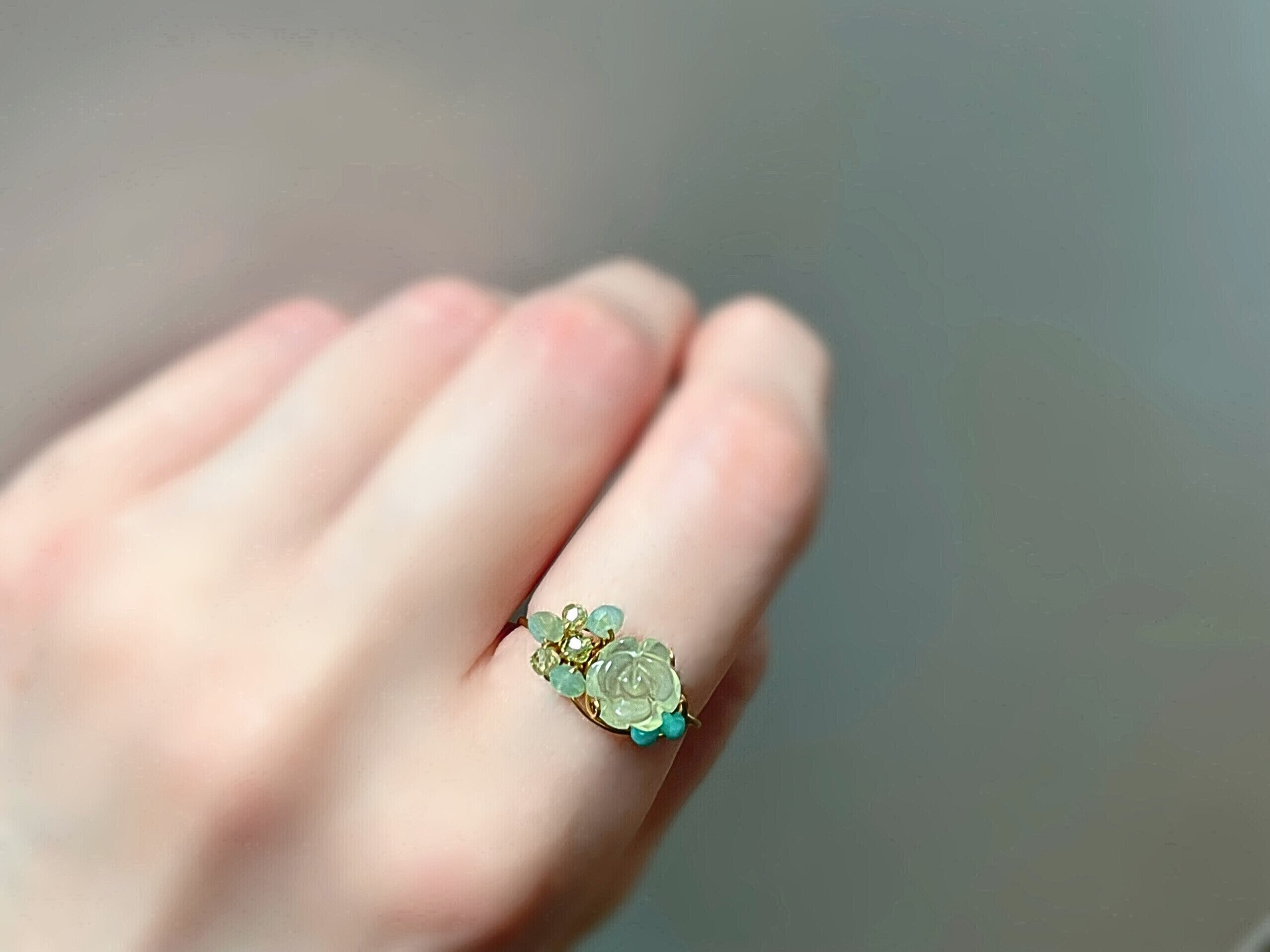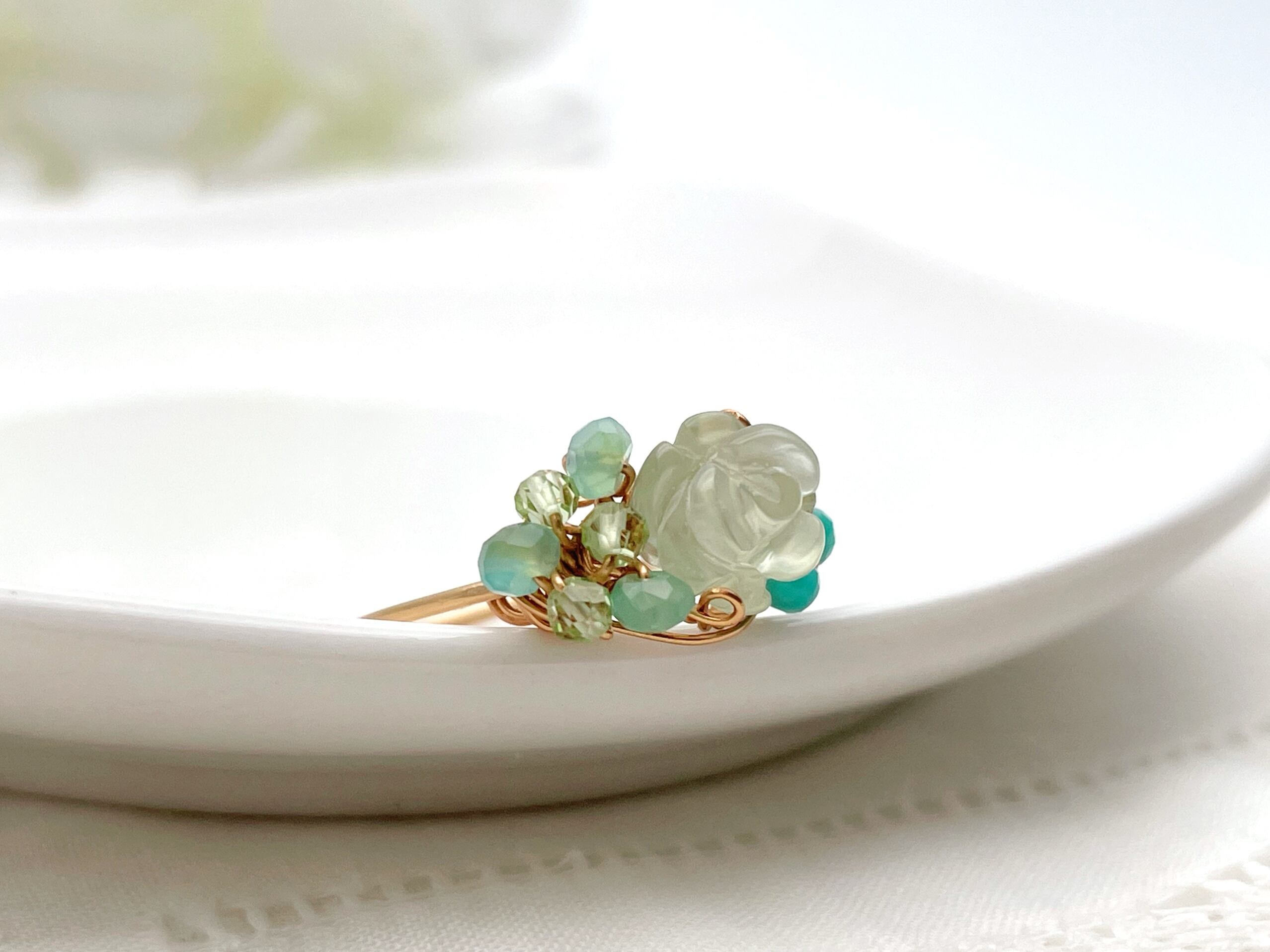 薔薇の彫刻が施されたプレナイトと小さな天然石でお作りしたワイヤーリングです。