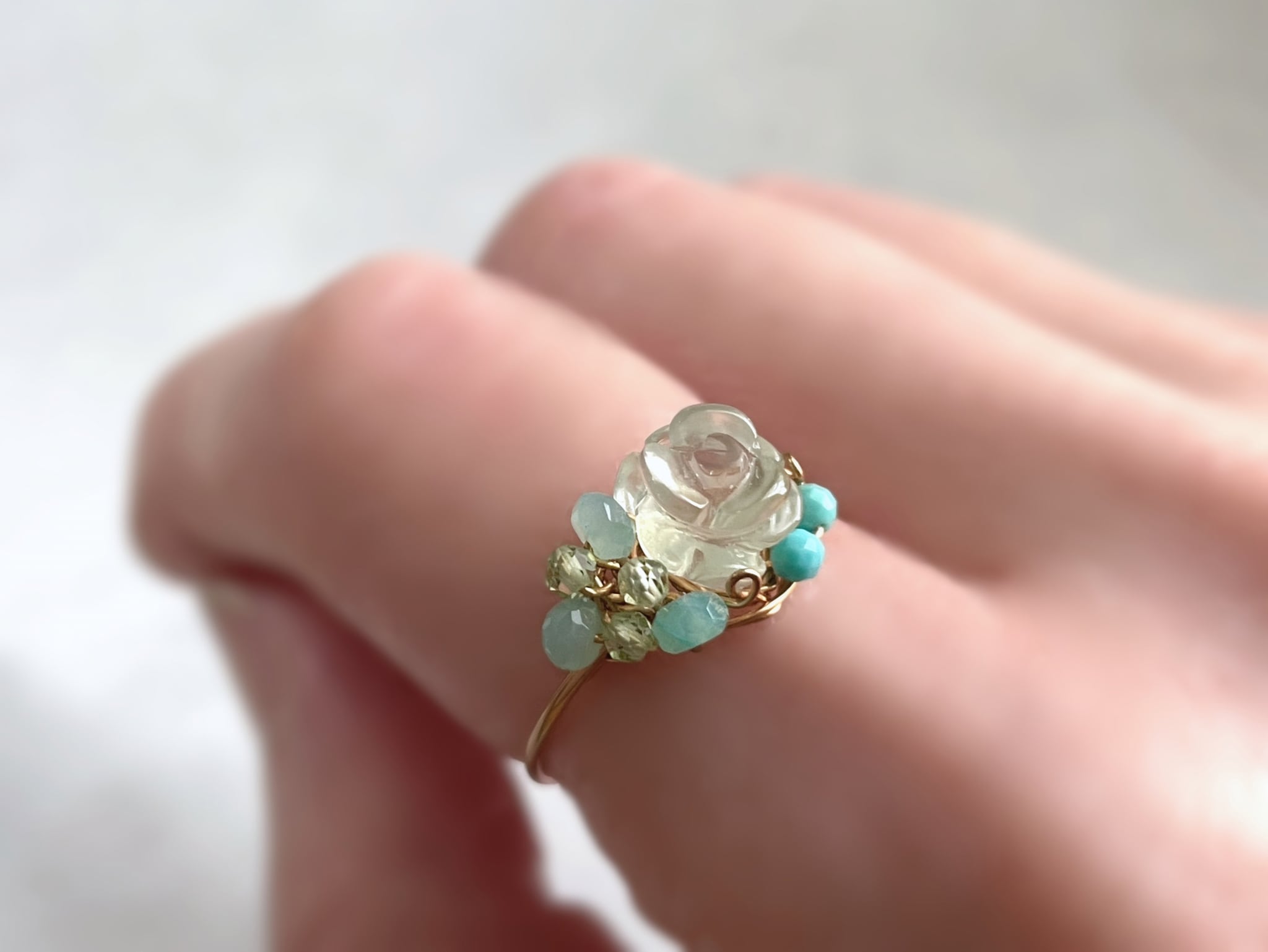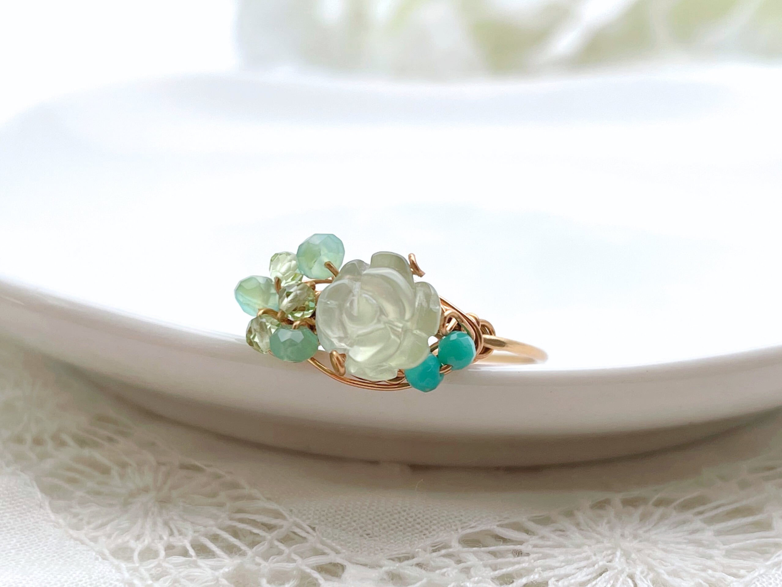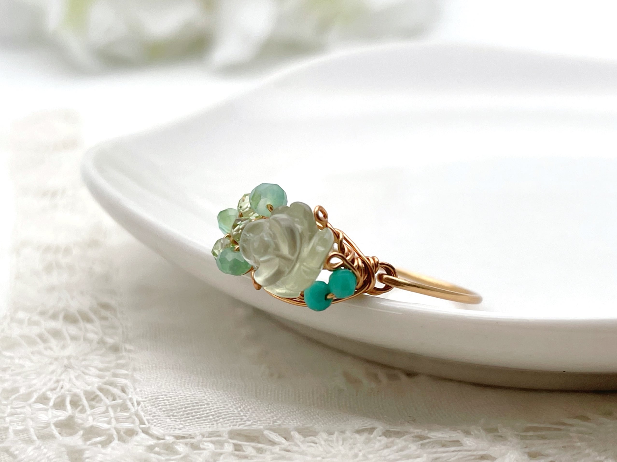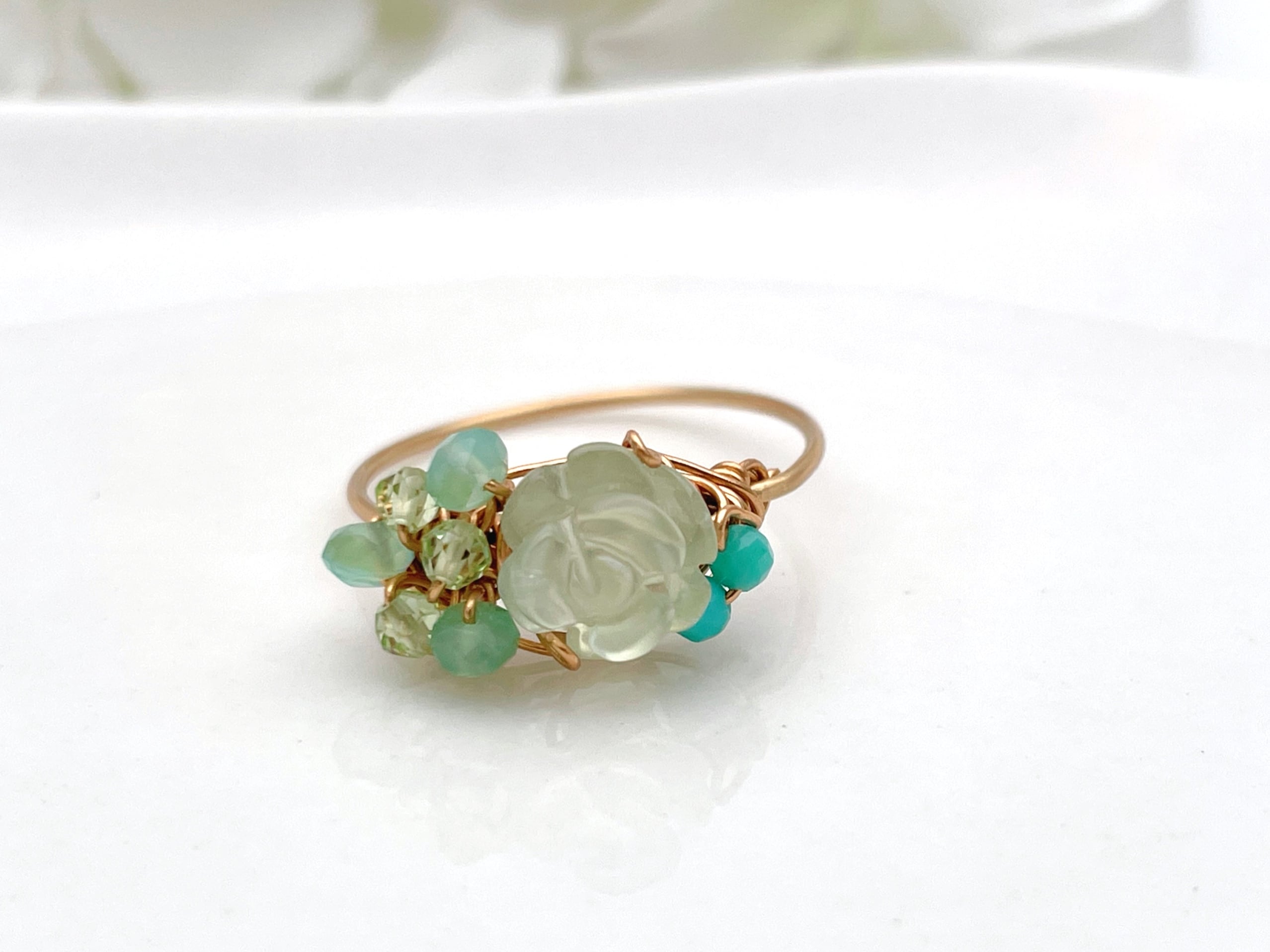 Marie's garden rose - プレナイトと3種の天然石のワイヤーリング