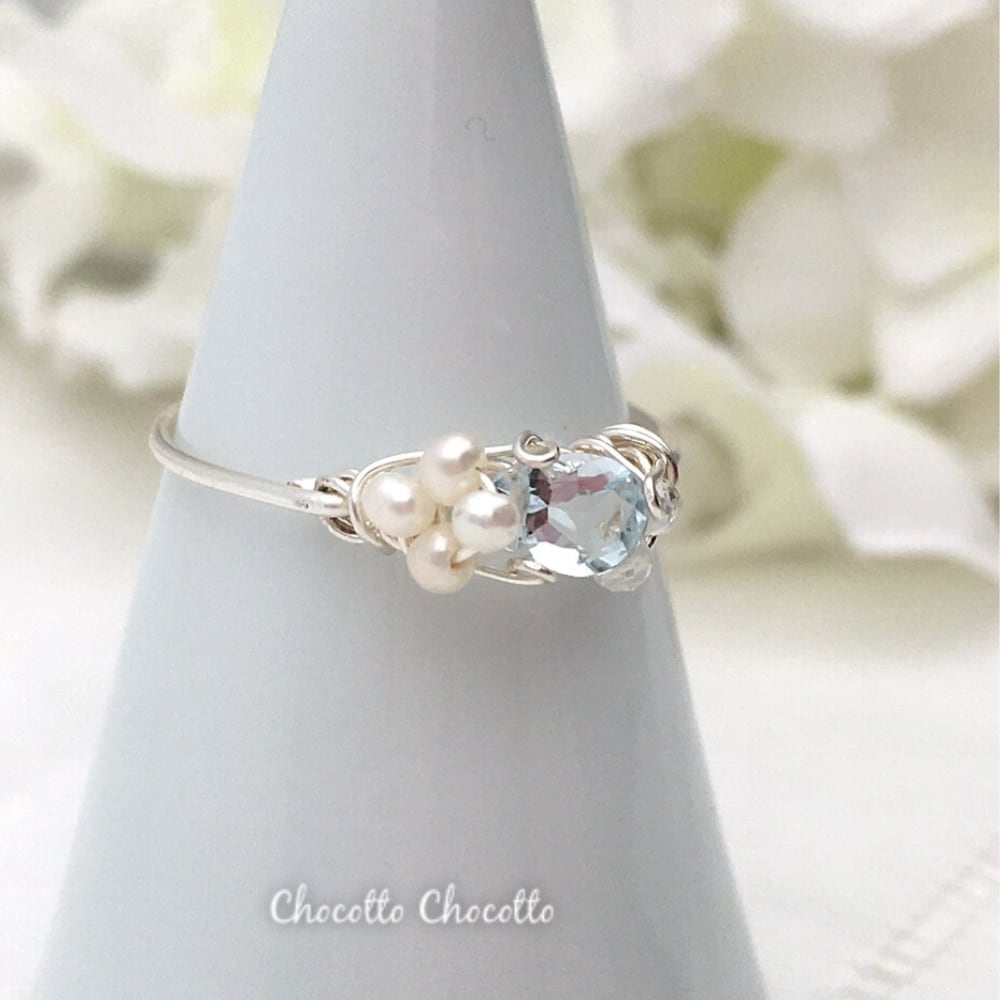 アクアマリンに淡水パールとホワイトトパーズの装飾を施したワイヤーリングです。