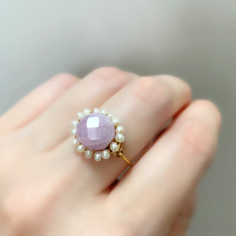 【4月制作作品】クンツァイト 淡水パール ワイヤーリング | ラベンダーの輝きを真珠で縁取った贅沢な指輪